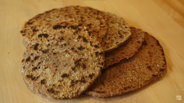 Грубо измолоть 350 граммов полбы (пшеницы-двузернянки, эммер, или как там ещё её называют?..), 240 миллилитров воды (скорректировать в соответствии с влажностью и степенью помола вашего сырья), опционально пол-ложки соли (на стенах ничего про неё не нарисовано, но соль в хлеб обычно добавляли) и стартер для выпечки (тоже ничего не нарисовано, но исторически правильными были закваска, кислое вино или дрожжи из шкурок винограда; закваску добавлять 224 грамма, другое не пробовали).