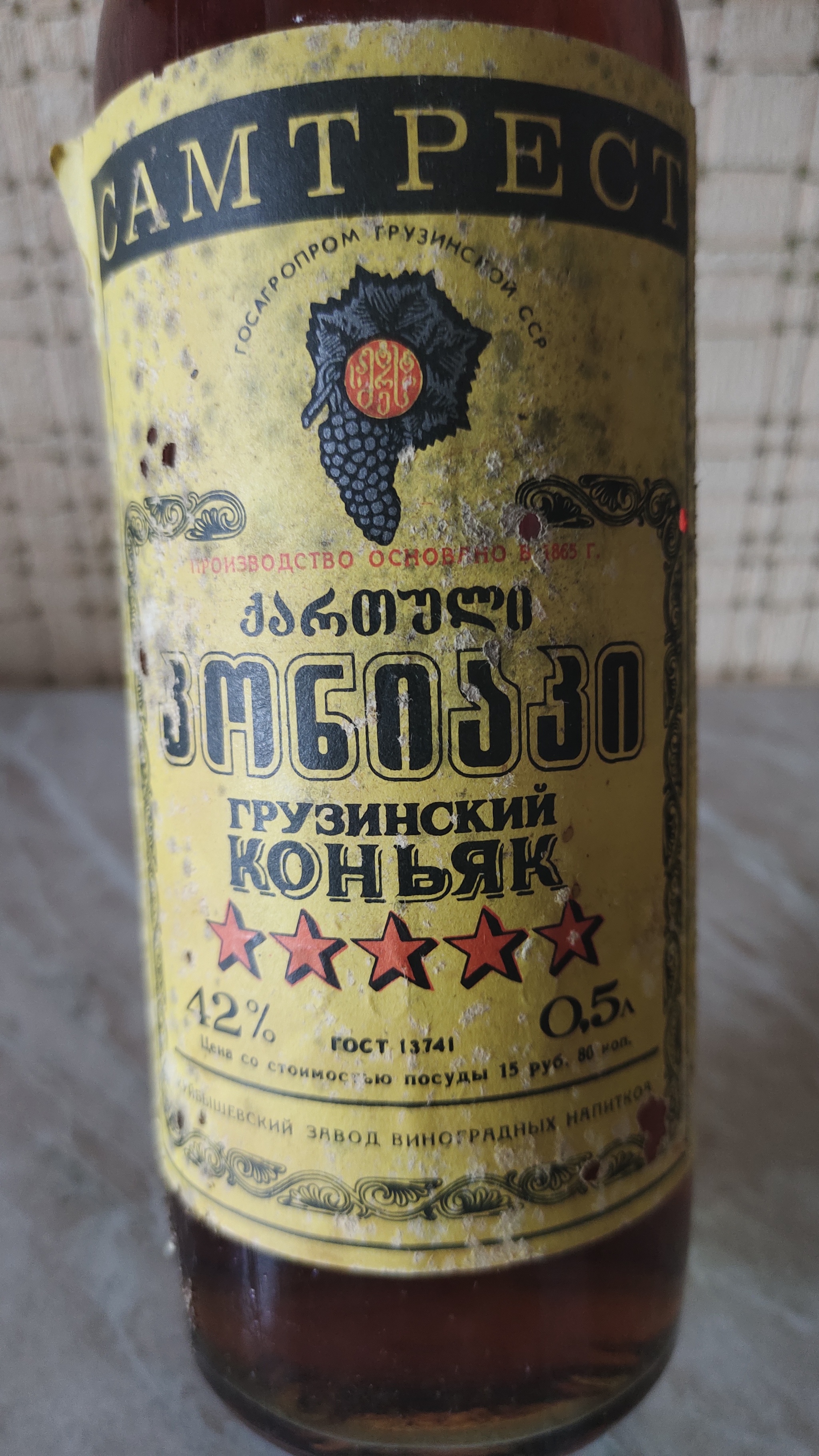 При разборе хлама в гараже старого родственника была обнаружена бутылка вот такого грузинского коньяка куйбышевского разлива.