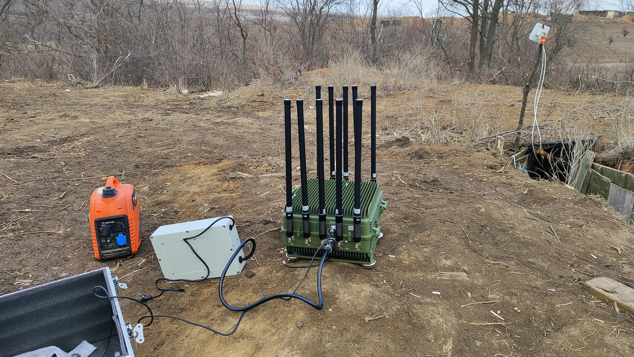 Хорошо в комплекте провод для подключения к 220 - поэтому для проверки мы поехали на полигон, подключили его к генератору - по легенде учений этот РЭБ должен был создавать непроницаемый зонтик для защиты блиндажа и близлежащих окопов.