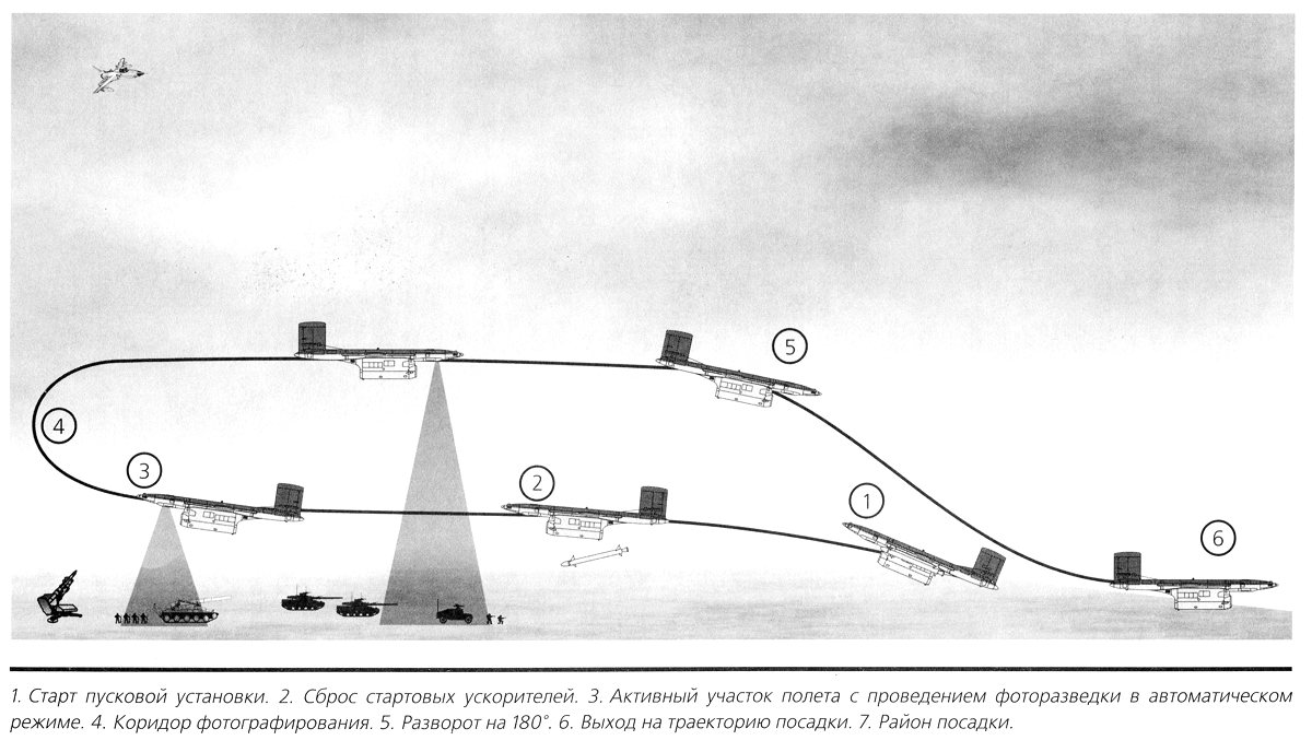 Впрочем, и наш БПЛА тоже был таковым, но не полностью. На борту имелся отсек с разведывательной, навигационной и другой аппаратурой. После возвращения с задачи аппарат выходил в заданную точку, после чего раскрывался тормозной парашют. Отсек с аппаратурой после этого отстреливался и приземлялся на парашюте. Для более мягкой посадки после отделения выпускались четыре опоры, на которые осуществлялось приземление. Остальная же часть беспилотника спасению не подлежала.