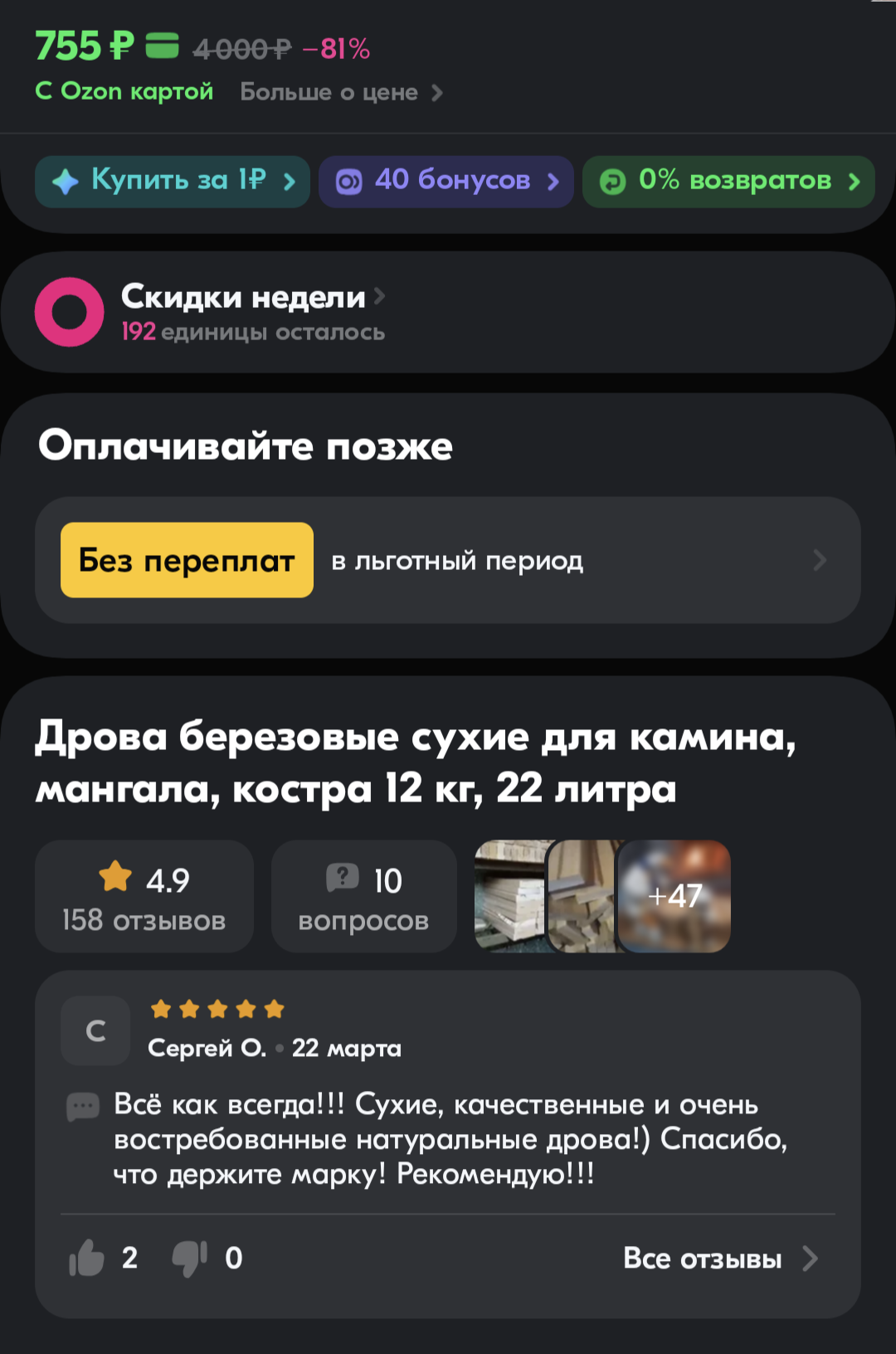 Листаю я тут на ночь глядя озон главную страницу. И вижу: дрова и куча отзывов к этим карточкам. Всё бы хорошо, но ценник это отдельная история.