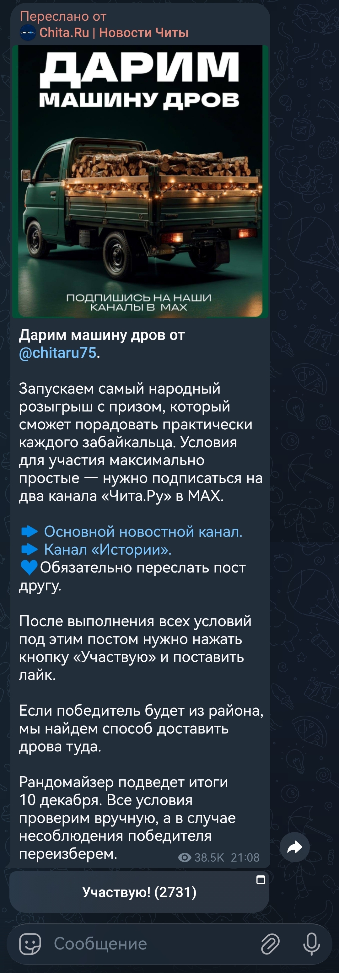 Скриншот розыгрыша, проводимого одним читинским изданием. Нужно подписаться на два канала в популярном мессенджере и поделиться с другом.