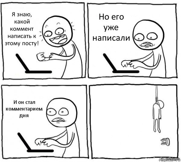Та же фигня постоянно. Читаешь пост, хочешь написать коммент. Заходишь, а он уже есть. И вообще пздц как обидно, когда он через время становится комментом дня и срубает кучу плюсов >_<.