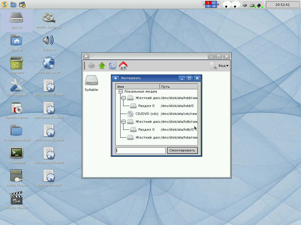 Проводник, если его можно так назвать, напоминает мне Windows 95 — файлы показывает, больше ничего там нет. Особенно доставил принцип подключения внешних носителей и дисков. Нужно открыть апплет «Диски», нажать по свободному пространству правой кнопкой мыши и выбрать пункт «Смонтировать», а далее найти своё диск из дерева устройств. Для меня ничего сложного, но непонятно, чего-бы не сделать автомонтирование. Впрочем, вспоминая прародителя Syllable AtheOS, можно сказать, что и это прорыв — терминал для монтирования дисков уже не нужен.