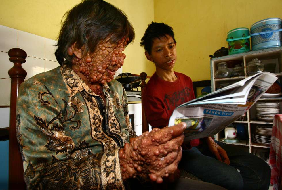 Нейрофиброматозом страдает и индонезиец Чандра Вишну (Chandra Vishnu). Только в другой ? своеобразной форме. Когда-то Чандра был привлекательным молодым человеком, но загадочная болезнь изменила его. Куда только он ни обращался ? и к врачам, и к знахарю. Тот отрезал кусочек опухоли и посоветовал закопать его под банановым деревом. Улучшения не последовало. Врачи сдались, и знахарь тоже. Сейчас Чандре около 60 лет, болезнь его неизлечима и, кроме того, передалась его детям ? на их коже уже появились характерные шишки. Правда, врачи успокаивают: далеко не факт, что их болезнь разовьется в столь тяжелую форму, что и у Чандры.