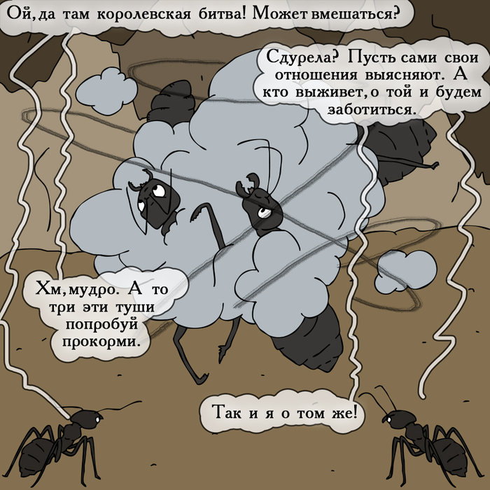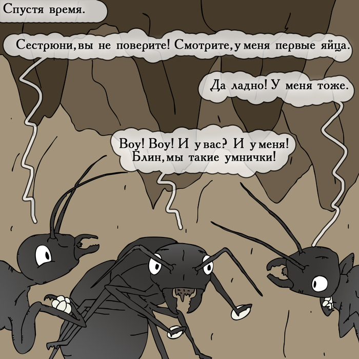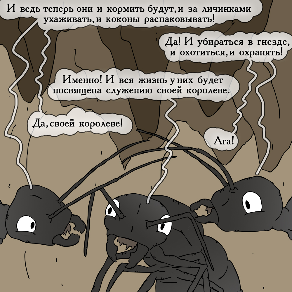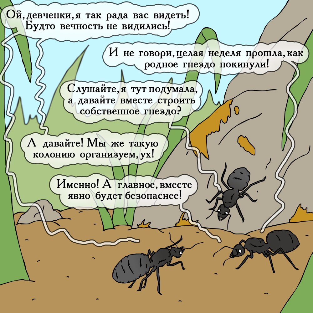 Факт-пояснение: Молодые королевы чёрных садовых муравьёв могут объединяться в небольшие группки для создания колонии. Они будут вместе до тех пор, пока не появятся первые рабочие. Т.к. в гнёздах данного вида царит моногиния, присутствие нескольких маток невозможна. Поэтому королевы устраивают битву, в ходе которой в живых остается лишь одна, именно о ней и будут заботиться рабочие.