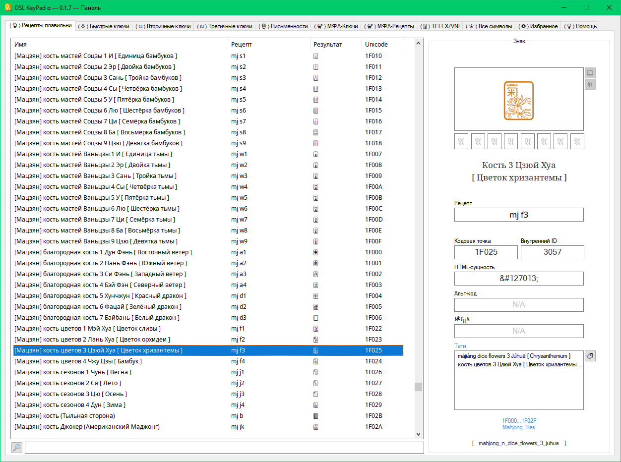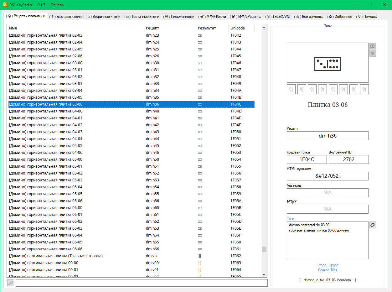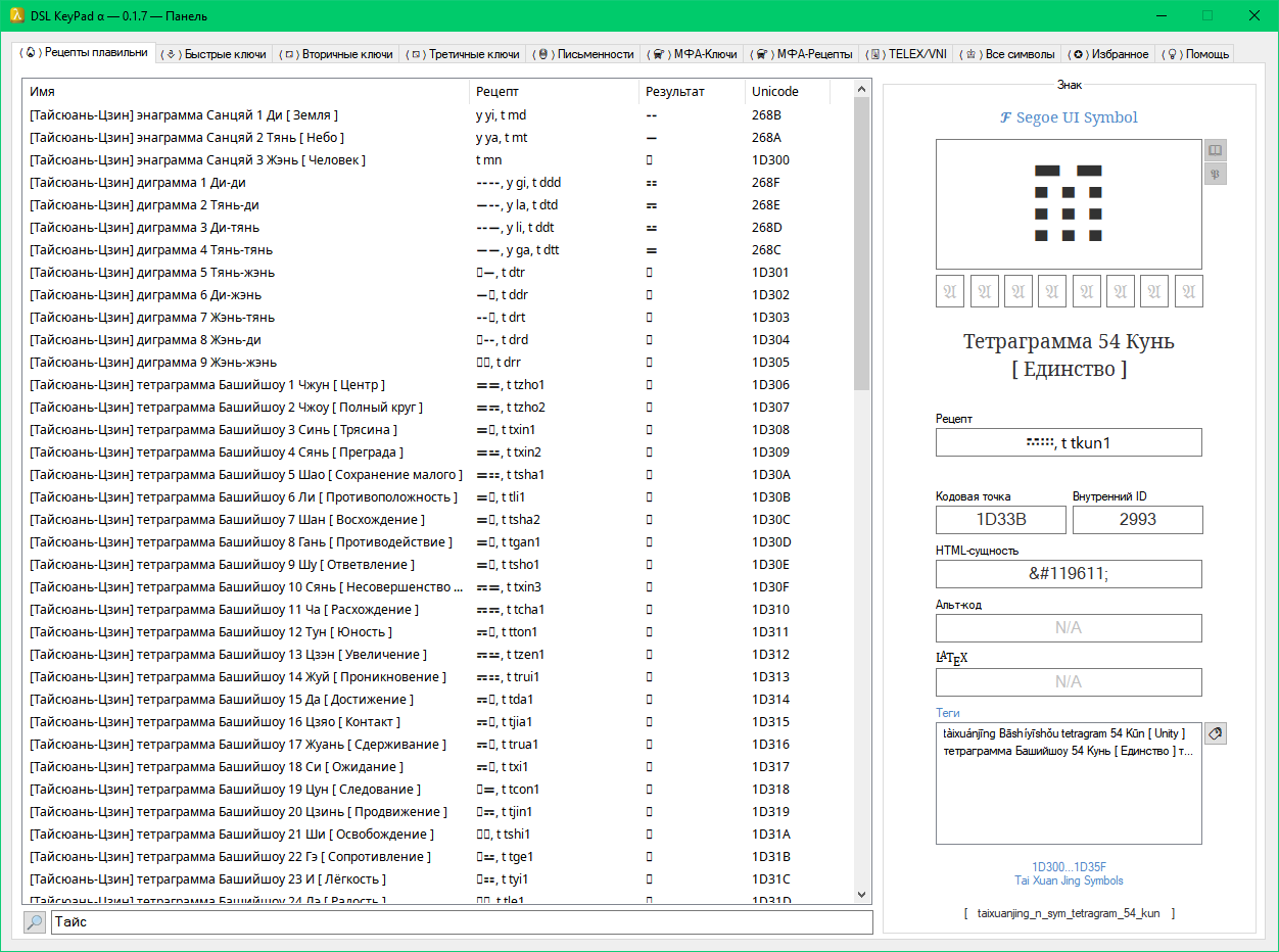 В предыдущем посте я рассказала о программе, позволяющей вводить тысячи символов Юникода с клавиатуры рядом способов: клавиатурные привязки, режим «Композиции» (аналог «Compose»), функция «Поиска». Понемногу продолжаю улучшать и расширять её возможности, а в этом посте описаны основные изменения за серию обновлений (0.1.3.2 α >>> 0.1.7.3 α).
