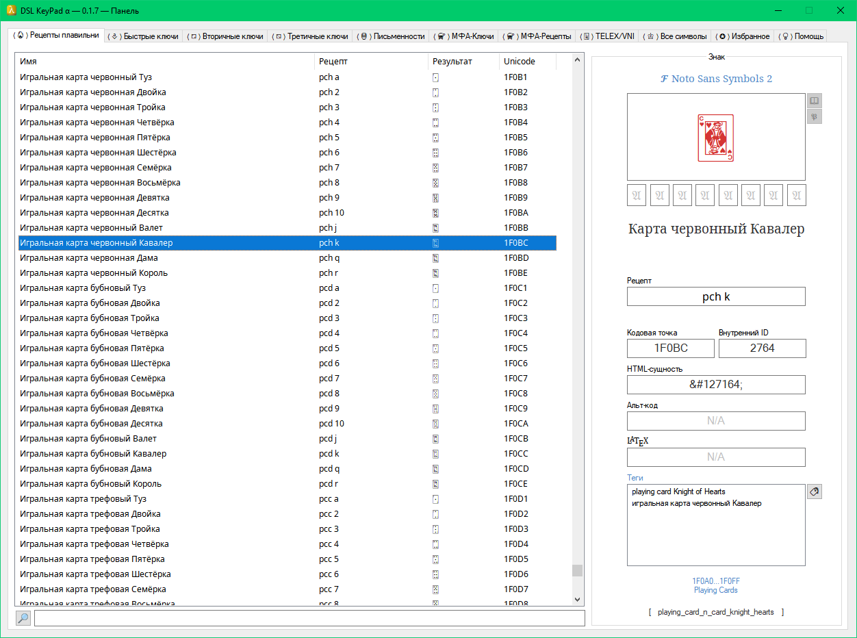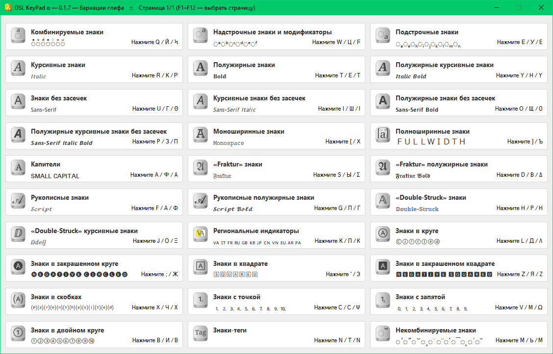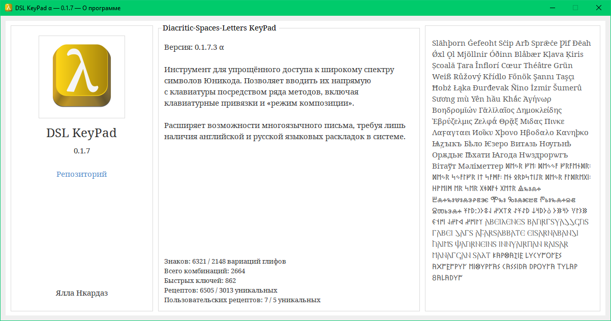 Для быстрой справки: библиотека программы состоит из внушительного перечня символов латиницы, кириллицы, греческого, ряда исторических форм письменности и иных различных символов: валютные, математические и пр. GitHub репозиторий с релизами тут.