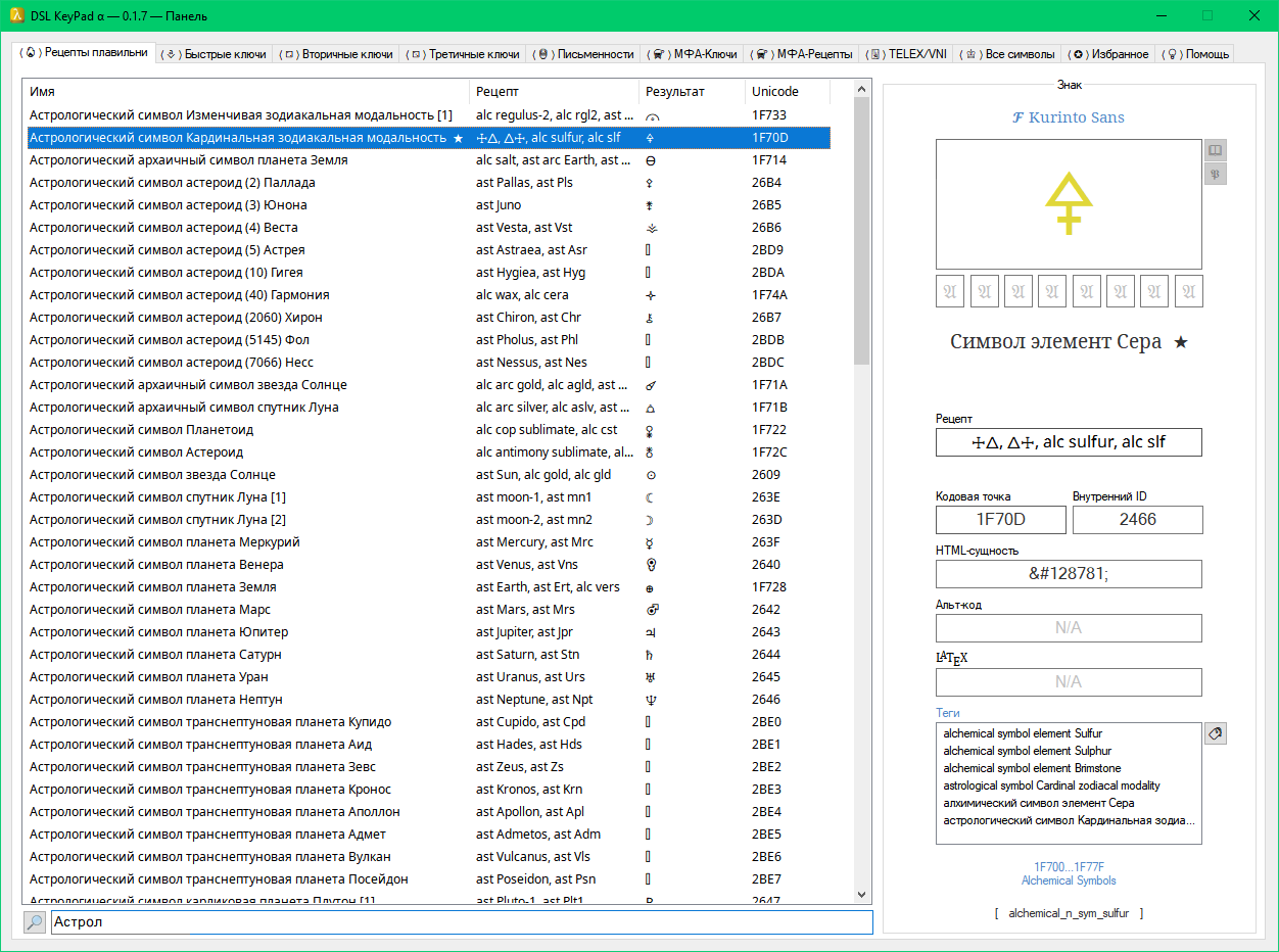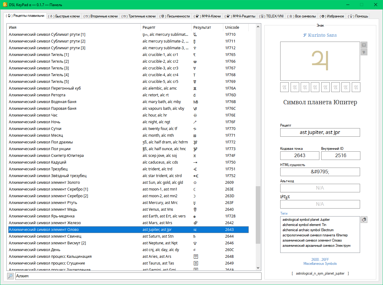 Пример: символ Юпитера «♃» в алхимии означает олово, и оба значения присутствуют в его тегах. При вводе «Олово» в строке поиска главного окна список отобразит «Алхимический символ элемент Олово» вместо стандартного названия «Астрологический символ планета Юпитер».
