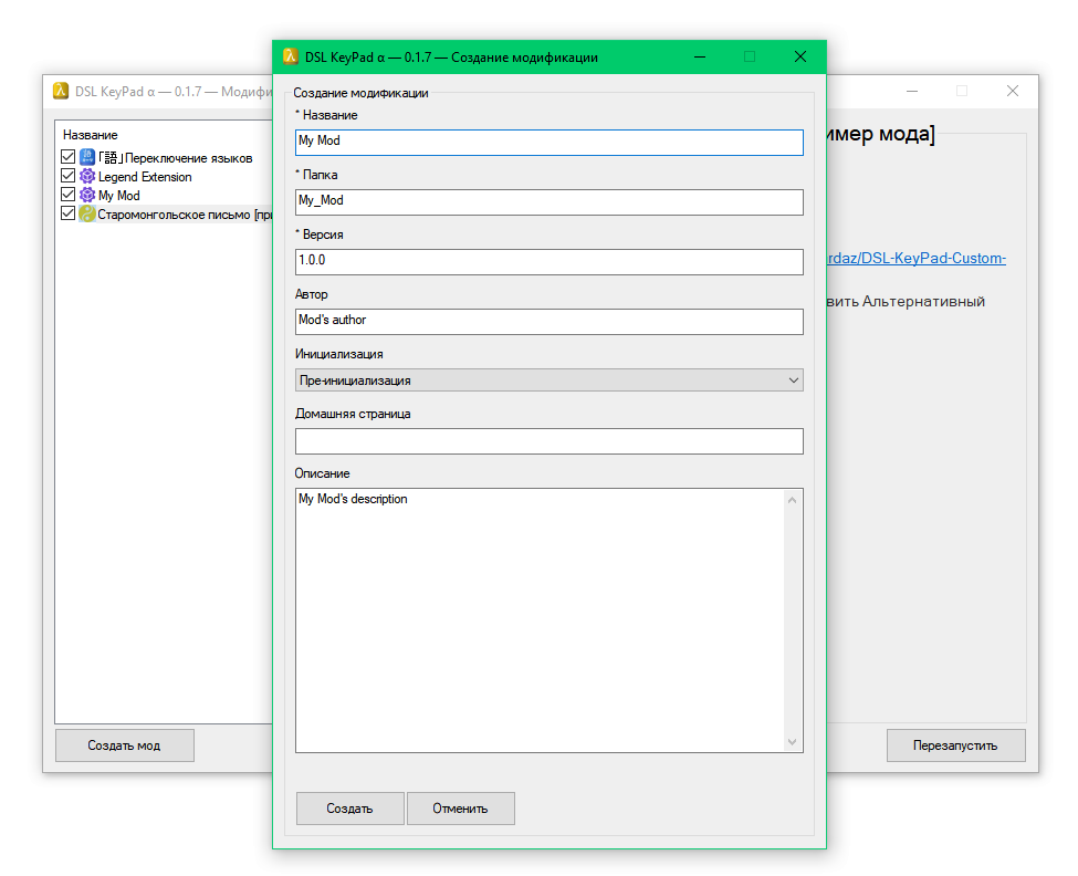 Изменения для модификаций: изменения файла информации о моде; добавлена возможность создать базовый шаблон мода прямо из окна модификаций; теперь создатель мода может добавить локальные настройки и они будут доступны через соответствующую кнопку в окне модификаций, однако интерфейс окна настроек необходимо будет создать самому