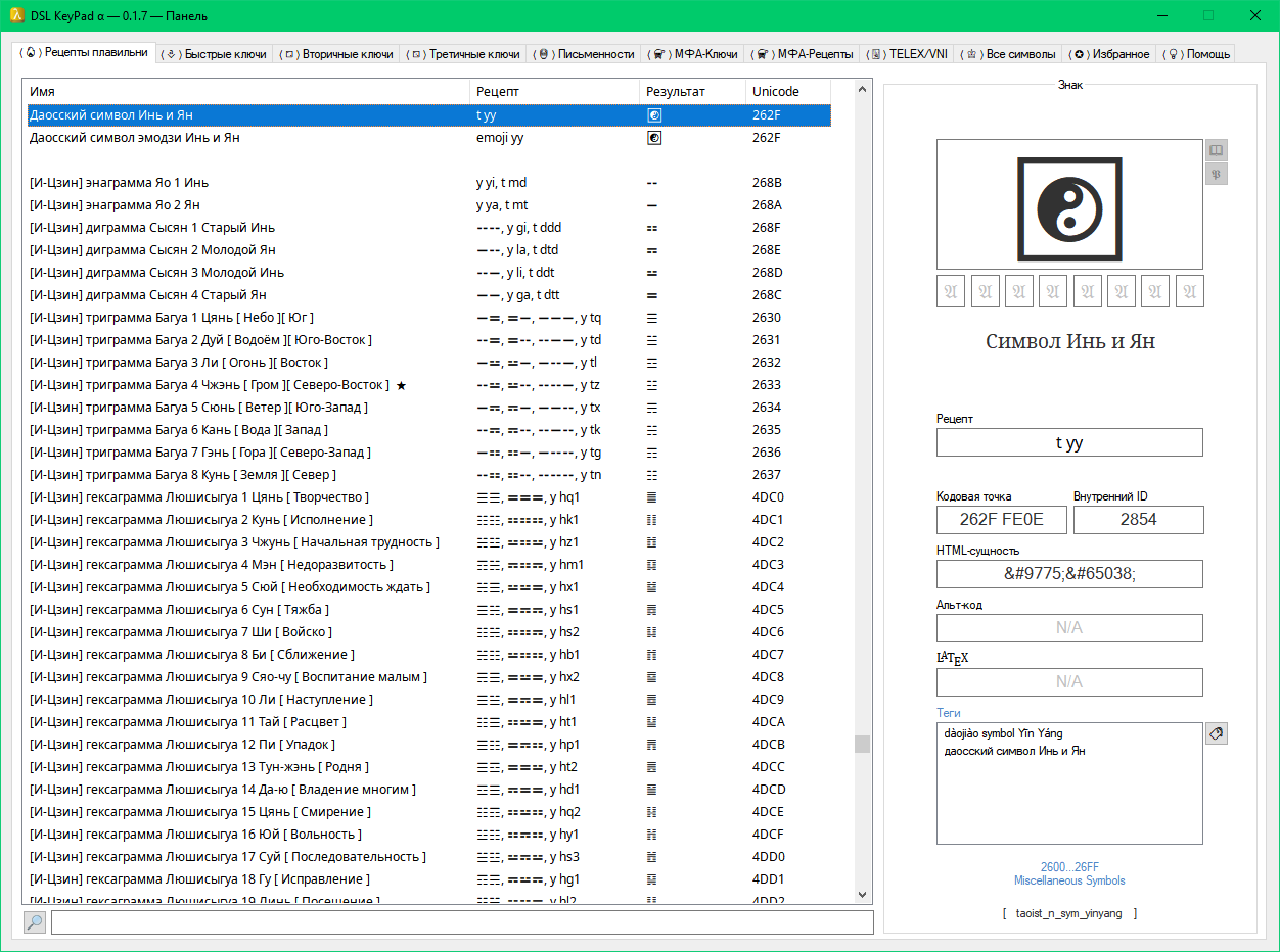 Вместе с ними добавлен и режим «Альтернативного ввода», но монограммы доступны и в стандартных привязках: RAlt + LAlt + 9 = ⚋⚊ / RAlt + LAlt + 0 = 𝌀.