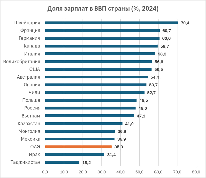Доля зарплат в экономике Объединённых Арабских Эмиратов составляет всего 35,3%. Это в 1,5-2 раза ниже, чем в странах Европы и на 30% ниже, чем в России.