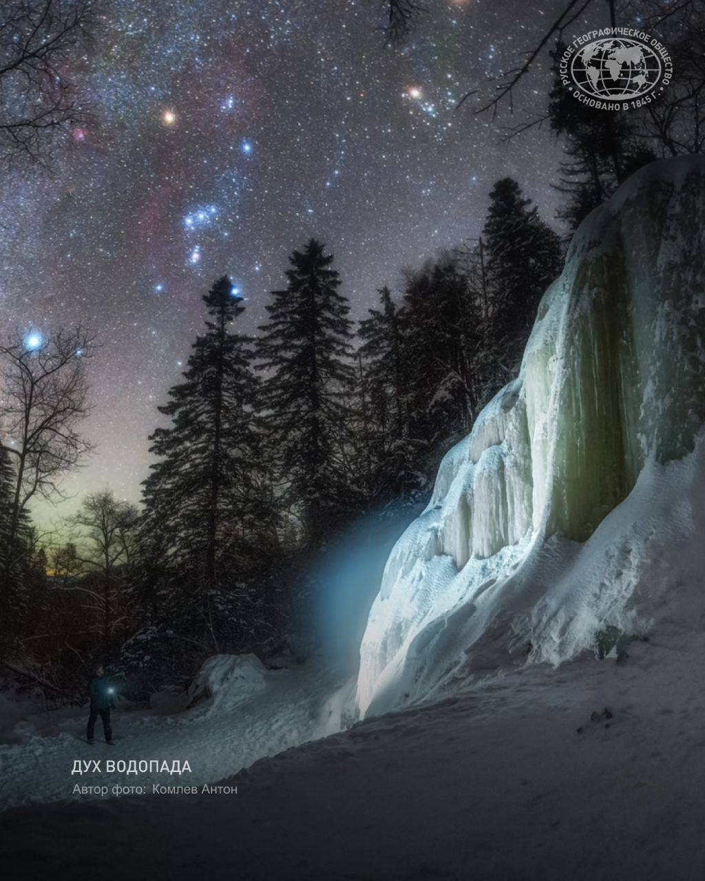 Автор фото, участник фотоконкурса «Самая красивая страна», Антон Комлев: "Когда я стоял около него ночью, то слышал, как лёд трещал. Словно водопад разговаривал со мной! Было немного жутко, так как треск водопада походил на треск веток в лесу".