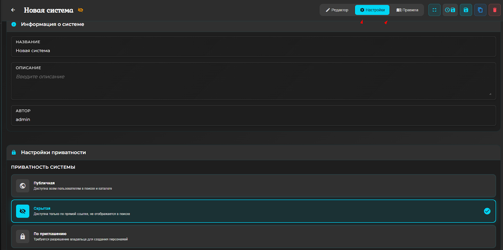 Раздел настроек - место, где вы сможете создать название\описания и указать авторов системы, а также указать тип приватности для нее.