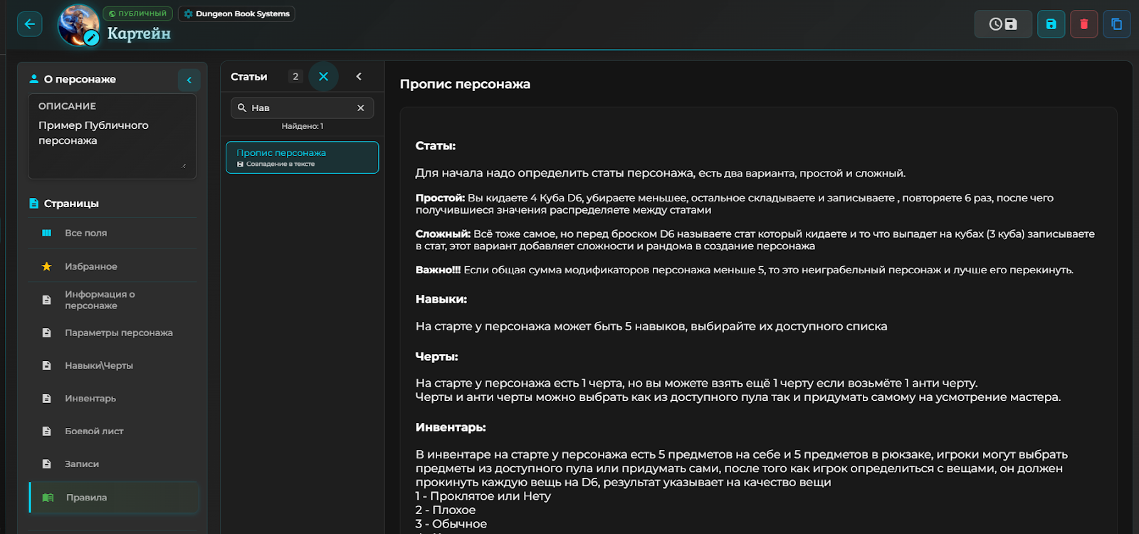 Правила - это своего рода справочник по вашей системе. Заполните это место, и вам вместе с вашими игроками больше не придётся копаться в живой или электронной макулатуре. У нас есть умный поиск, который ищет совпадения по содержимому статей, а также этот раздел всегда доступен прямо с листа персонажа.