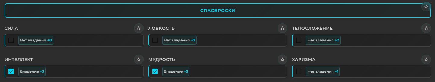 5) Флажок - поле для отслеживания различных состояний, а также это поле может иметь в себе целых две формулы за раз. Например, спасброски из D&D 5e.