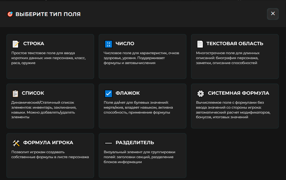 6) Системная формула - эдакое поле, которое и не поле вовсе, а просто вывод данных по формуле, которую мастер написал. Сделано это для того, чтобы игрок никак не мог воздействовать на нее.