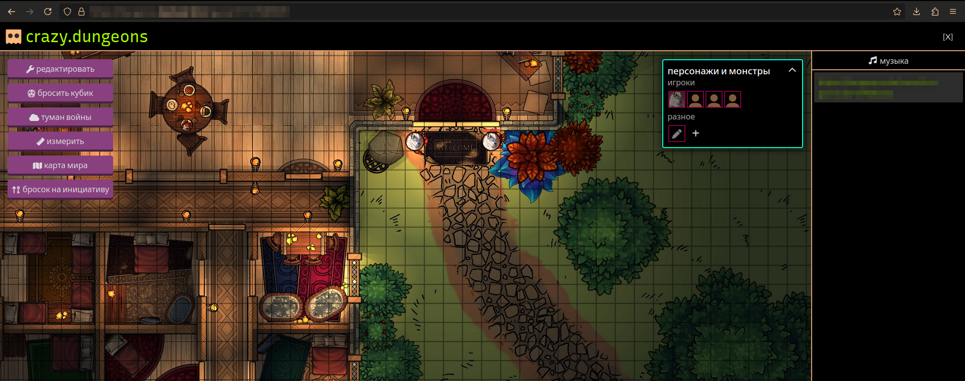 справа отображаются броски кубиков, есть чат и показана ссылка, которую надо игрокам давать, когда по ней переходишь (я ещё замазал - там мой сайт отображается). Про ссылку подробнее - её нужно давать игрокам, при переходе на неё каждому будет предложено придумать имя персонажа, а со стороны мастера подземелий выскочит запрос в левом верхнем углу на присоединение игрока к игре, после подтверждения мастер должен игроку назначить персонажа