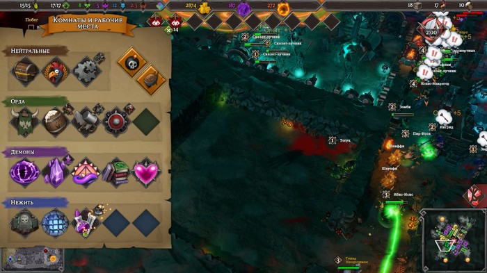 Авантюристы не дураки. Без хиллера в пати (а то и не одного) не ходят, и если на поверхности, я могу выделить своих орков рамкой и приказать им оббежать гнома-танка, атаковав конкретно лекаря, и бойцы даже меня послушаются, то под землей хрен там плавал. У подручных «включается» собственный интеллект, и они, естественно, начинают атаковать ближайших противников. Сражающиеся же за дело Добра герои явно заканчивают в своих крепостях курсы молодых авантюристов. Азы того, как правильно «проносить» дандж, они знают. Рыцари и паладины идут впереди, за ними выстраиваются маги, лучники и инженеры. Лекарей же прикрывают все. Понимаю, всё это сделано во имя и ради баланса, но выглядит немного по-дурацки. Тем не менее, сочетать управление подземельем с вылазками на поверхность действительно интересно. Приходится думать, как об атаке, так и об обороне. Выводить все силы на поверхность, чтобы атаковать вражескую крепость – чревато, ведь пока твои орки пробиваются через вражеские ворота к одной контрольной точке, из другой может появиться группа героев и ворваться в беззащитный дандж. Ну, или бесята внезапно откопают какую-нибудь опасную крокозябру, пока вся армия зла пребывает в походе. Впрочем, в игре есть хорошее заклинание «Тёмный портал», позволяющее быстро вернуть солдат домой, но на его разыгрывание нужна мана, с которой случаются перебои.