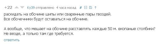 Сегодня, когда была большая вереница из автомобилей и движение шло медленно, я как обычно ехал по обочине и проколол себе оба колеса либо гвоздями, либо стеклом.. Ну думаю трындец, идти пешком теперь.. прошагал минут 20, уже почти пришел к городу и тут вижу - менты с каким-то водилой разбираются - как оказалось он каждые 50 метров разбрасывал ассорти из осколков и гвоздиков на обочину, подкрепив словами "Чтобы мудаки по обочине не обгоняли". Я тут же встрял в эту разборку, сказав что я из-за него колеса разорвал, и, оказывается менты тоже прокололи колеса, обгоняя всех по обочине с мигалкой.. Короче я ничего так и не добился и потопал дальше.