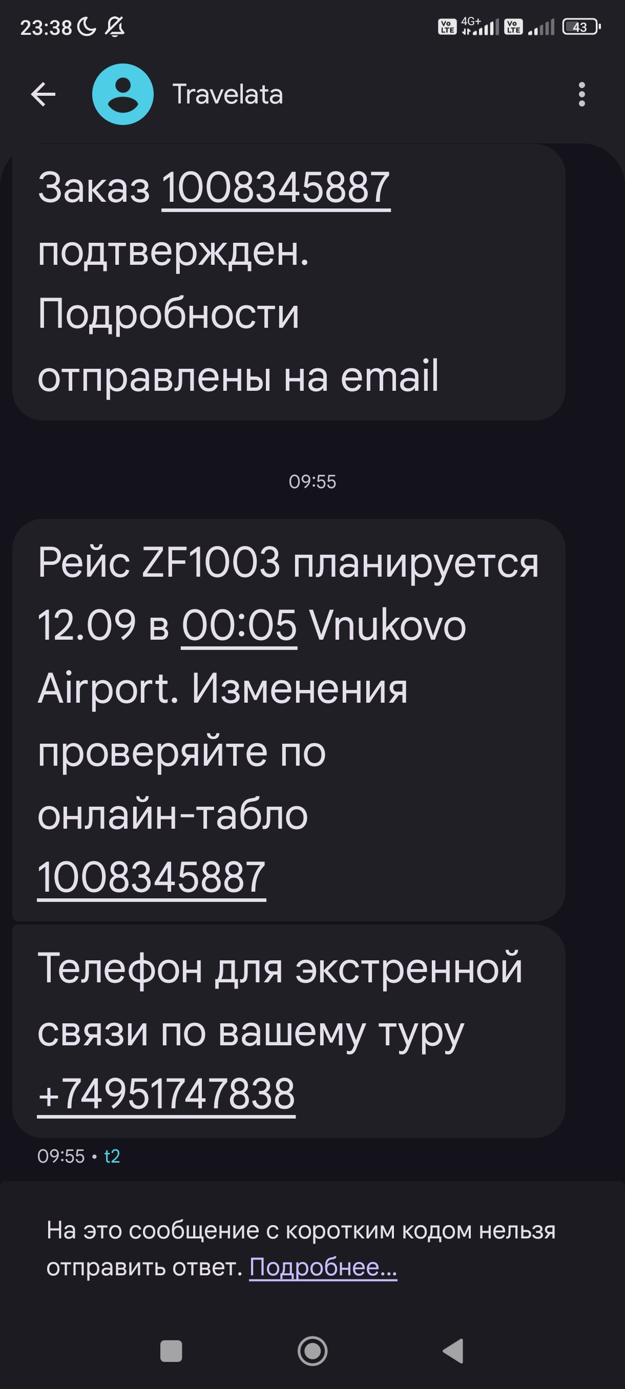 Заказала, оплатила тур ещё в июне. Туроператор Травелата прислал за 2 и 3 дня информацию по туру на почту. Вылет в Анталию был указан на 12 сентября в 13:10. В письме также было указано ориентироваться на смс, которое поступит накануне (чартерный рейс может поменяться, это нормальная практика). И мне пришло смс вчера утром: