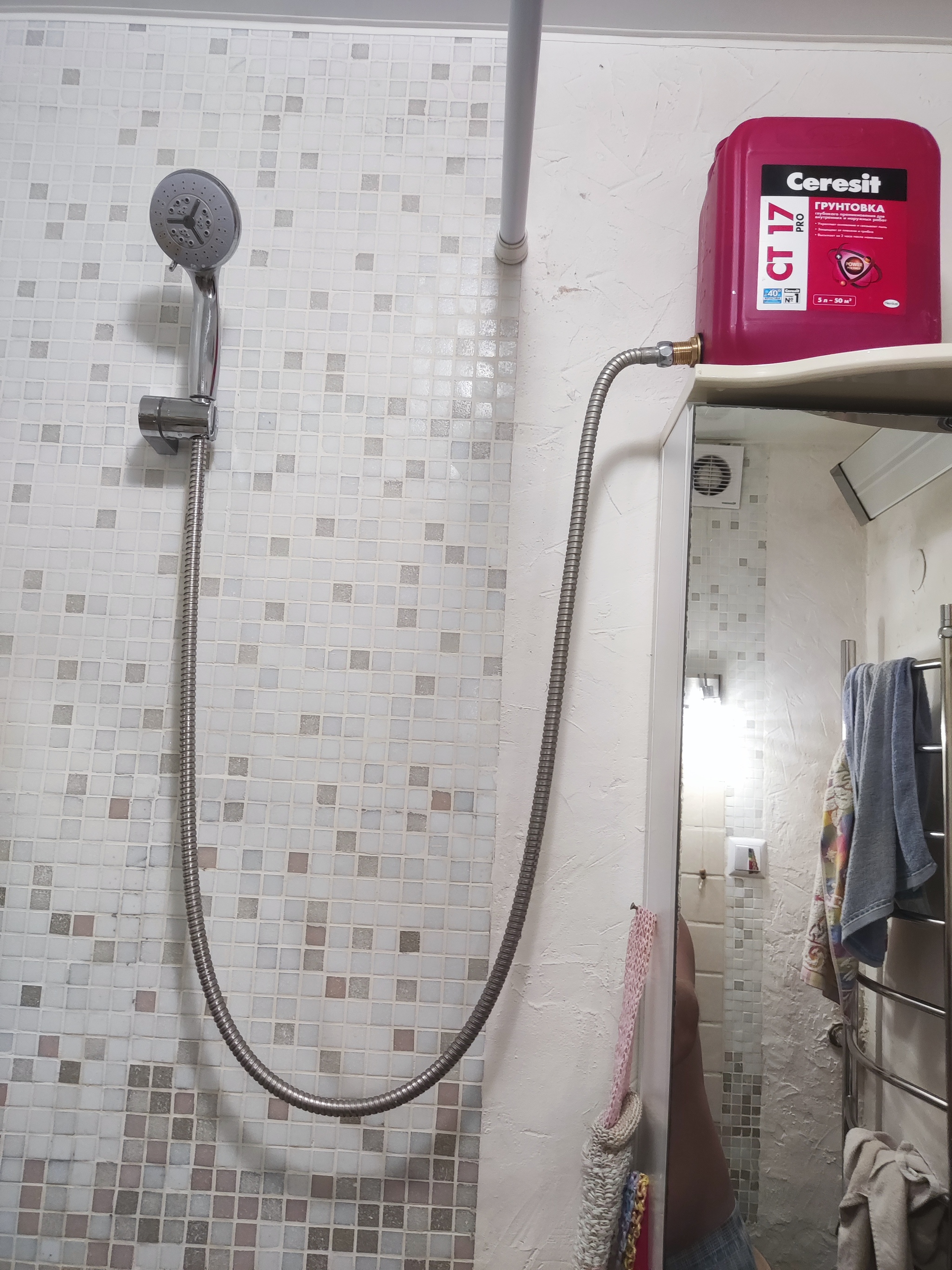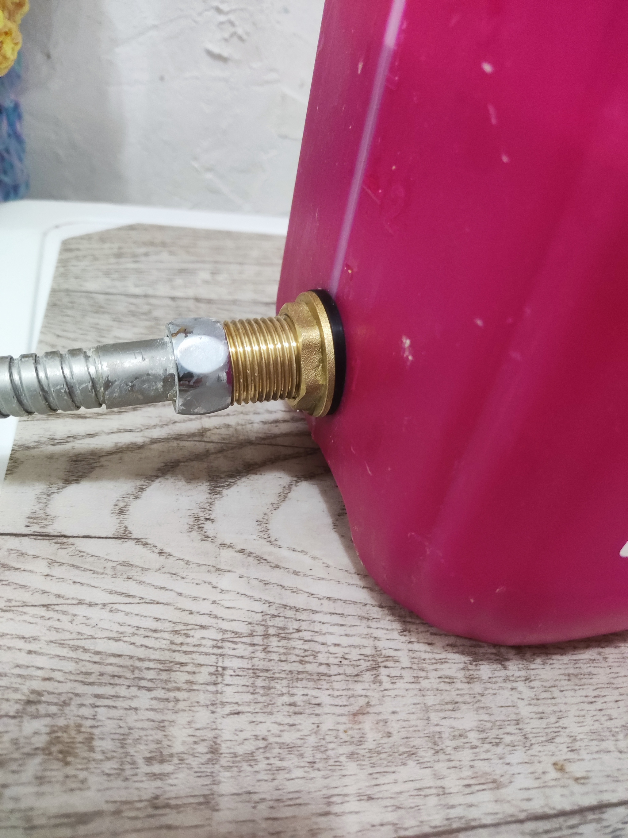 Покупаем на вб ,озоне или ближайшем магазине сантехники,штуцер он же врезка в бочку на 1/2 . Монтируется в канистру в моем случае 5 литров. Опытным путем установлено , что этого объёма воды достаточно чтобы помыться человеку ростом 176 см и весом 80 кг. Снимаем лейку с душа , на место лейки ставим заглушку что идет в комплекте с врезкой. И радуемся . Жена довольна , я доволен.