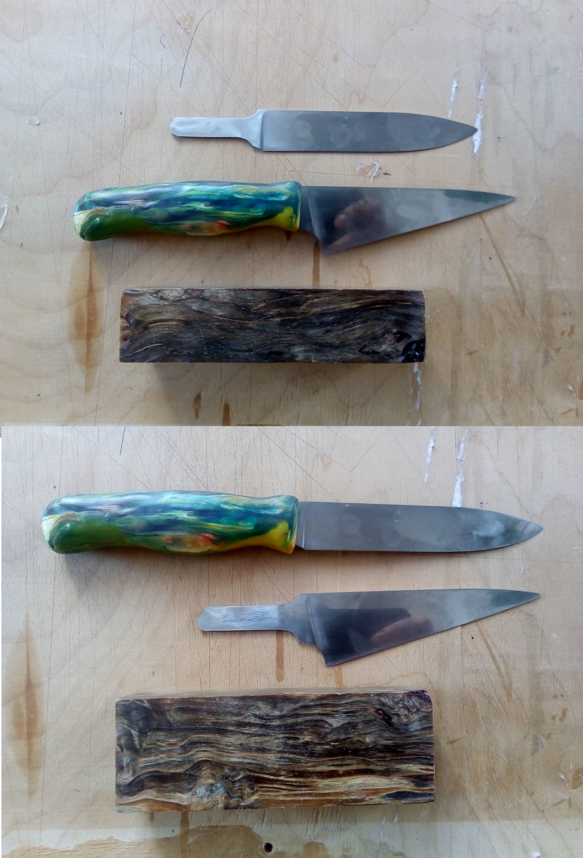 Брусок дерева распилил на две части. На кухне ножами орудует в основном жена. Ей толстые рукояти ненадобны. Из пластилина слепил удобную форму рукояти. Вначале решил сделать одинаковые рукояти, но позже сделал немного разные по форме, что бы на ощупь можно было отличить разные клинки. Да и точить неодинаковые удобнее, подгонять по размерам не надо.