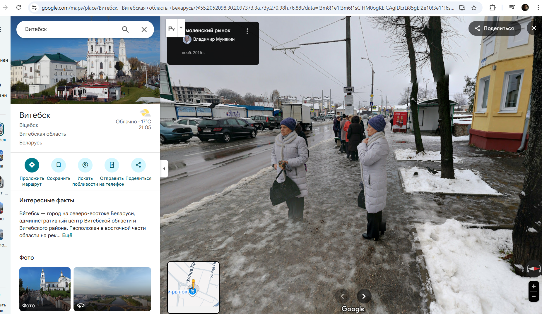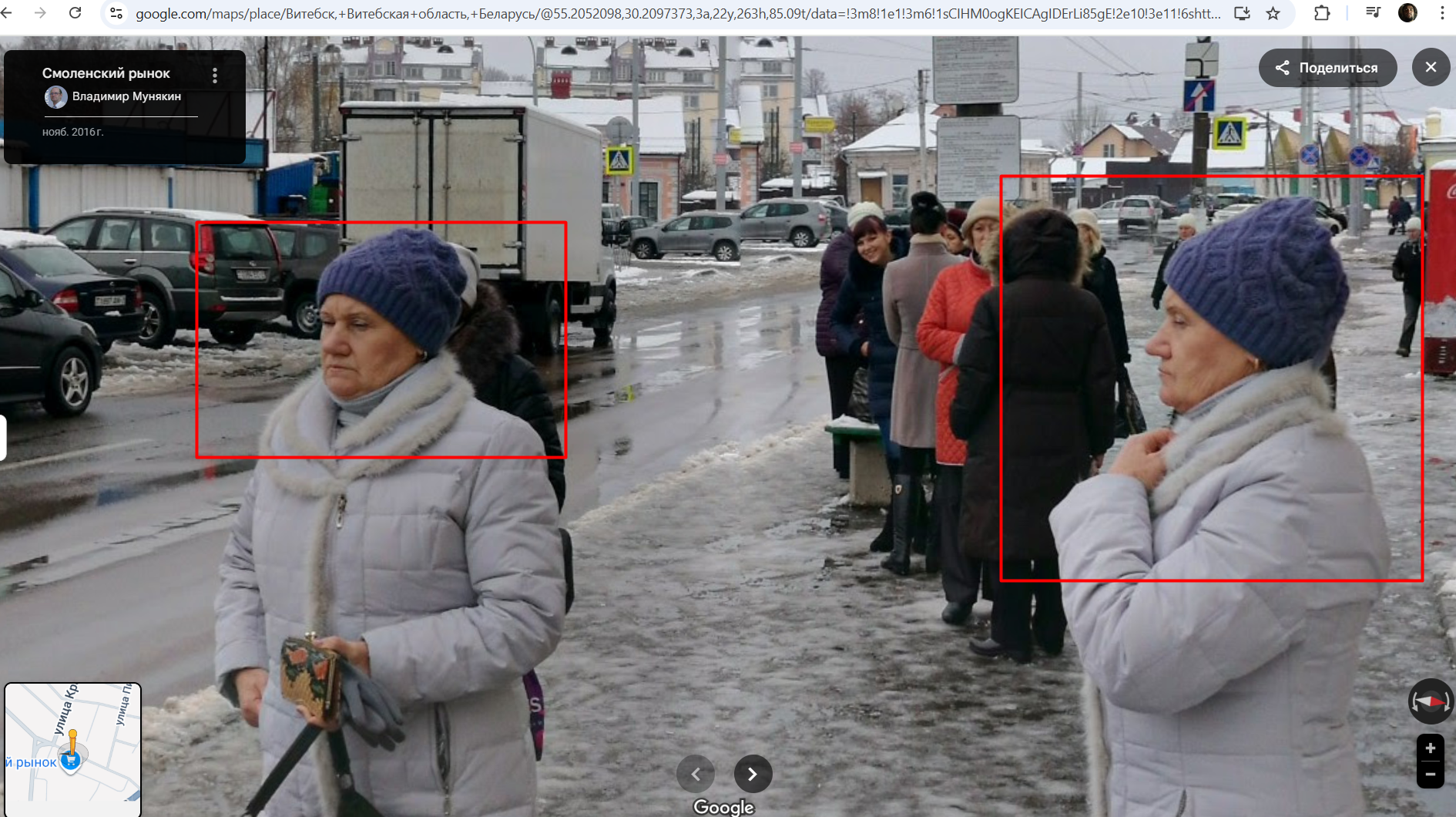 Друзья, вот я путешествую на диване по гугл-картам по Витебску и увидел 2 одинаковых тётки на одной фотографии! Близняшки? Даже одинаковые сумки и шапки, куртки? Как такое возможно? Есть тут специалисты?