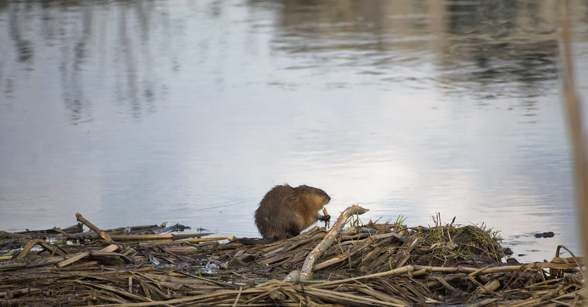 А с ондатрой у нас случилась целая "охота". Ну как охота. Чуча сделала вид что подкрадывается к ондатре. Но так как дело было в сухом прошлогоднем камыше-то громкий хруст спугнул ондатру на втором собачьем шаге.