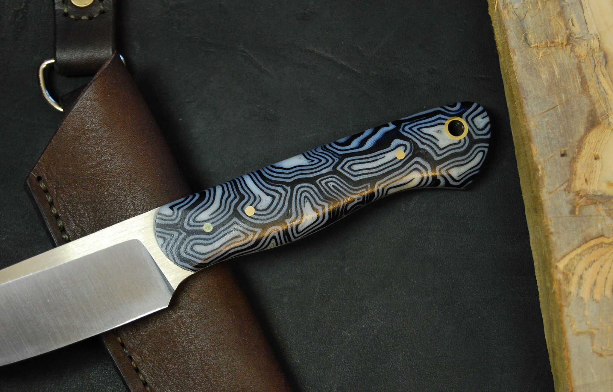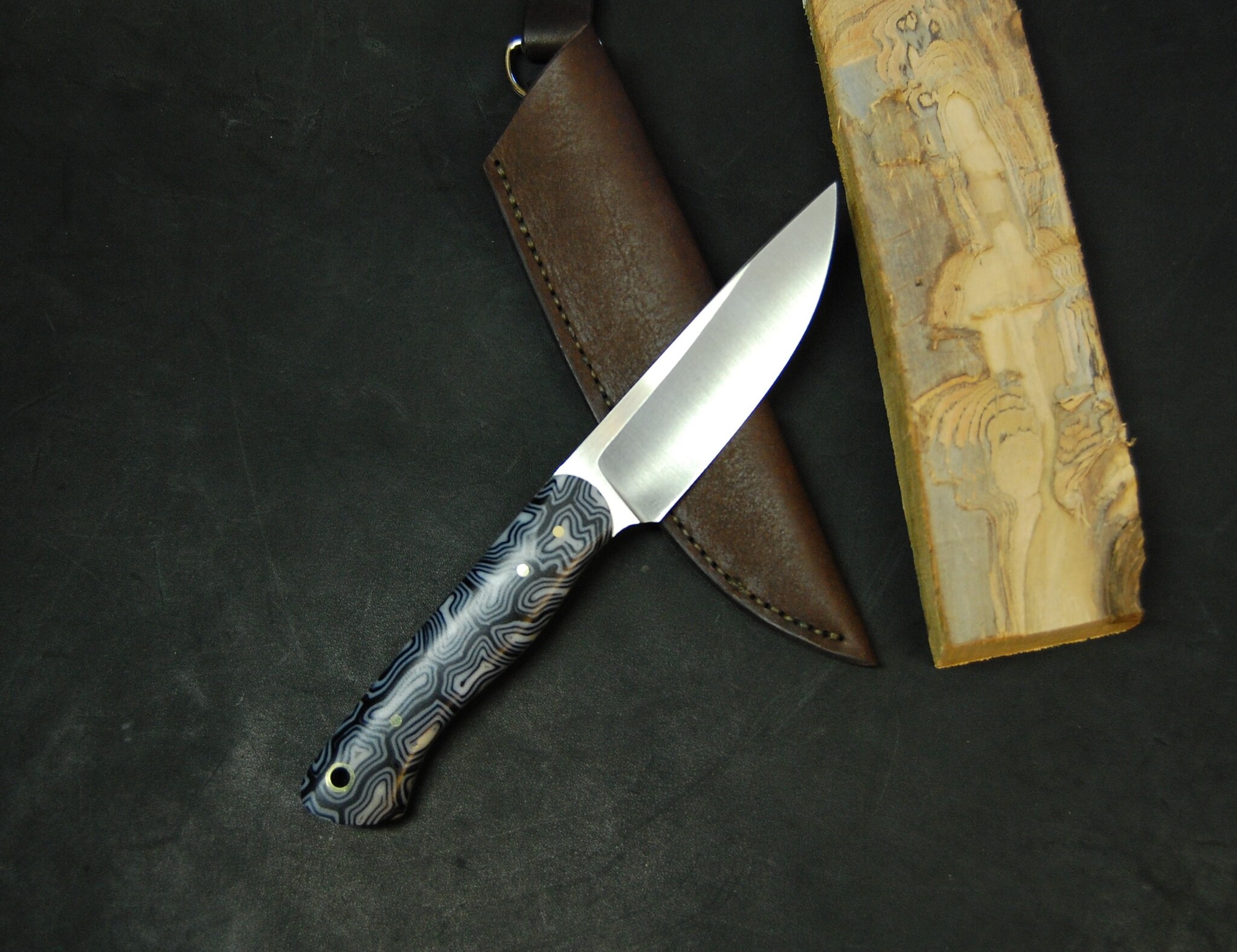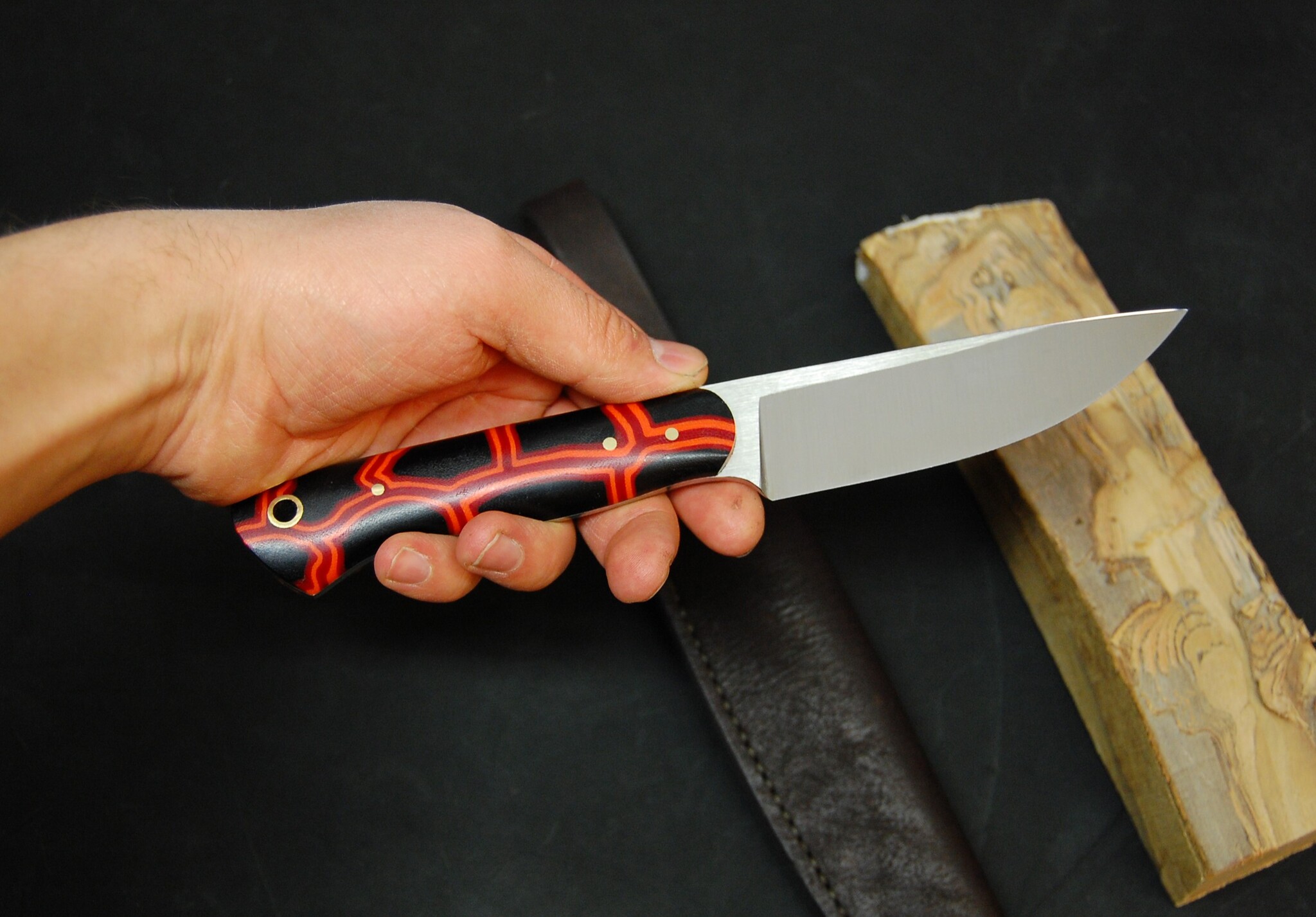 Считаю эти ножи максимальными универсалами. Форма рукояти ближе к кухонной, только слегка расширенная и удлиненная. 120 мм, хватит и для удержания в зимних перчатках. Форма клинка тоже простая, подойдет для любых задач. Высокие спуски для хорошего реза. При толщине 3 мм получается хороший запас прочности. Открытая рк, без выраженного упора для пальца для полноценной работы по продуктам. Микарта не боится повреждений и полностью нейтральна к воде. Главное не нагревать свыше 50 градусов и не мыть в посудомойке