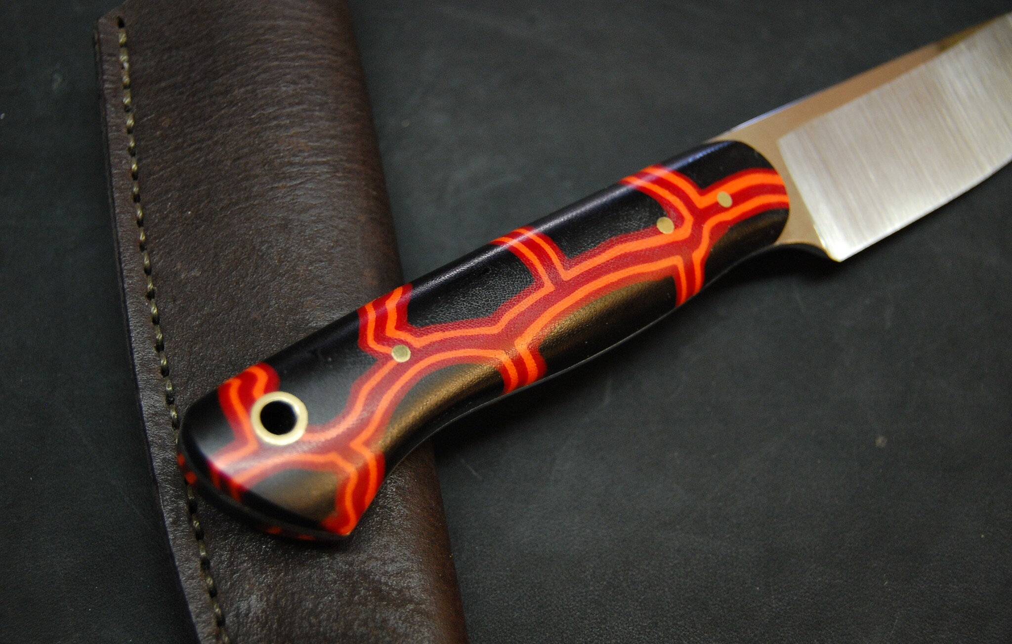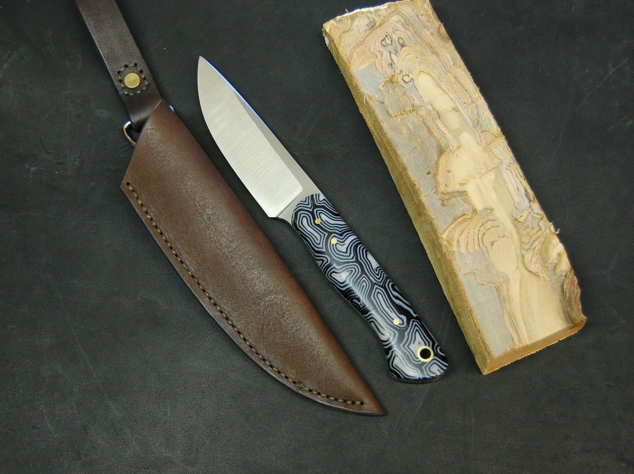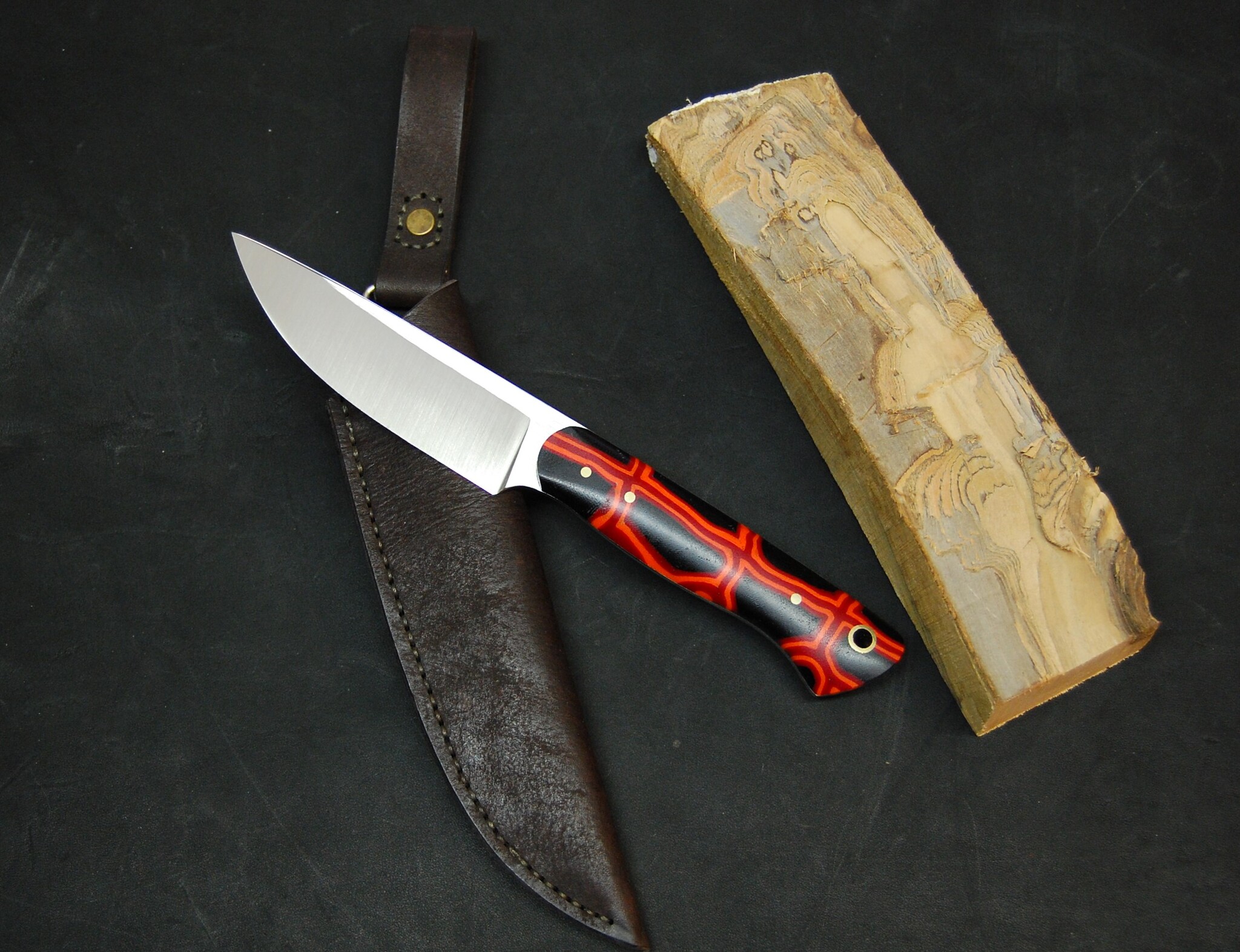 Считаю эти ножи максимальными универсалами. Форма рукояти ближе к кухонной, только слегка расширенная и удлиненная. 120 мм, хватит и для удержания в зимних перчатках. Форма клинка тоже простая, подойдет для любых задач. Высокие спуски для хорошего реза. При толщине 3 мм получается хороший запас прочности. Открытая рк, без выраженного упора для пальца для полноценной работы по продуктам. Микарта не боится повреждений и полностью нейтральна к воде. Главное не нагревать свыше 50 градусов и не мыть в посудомойке