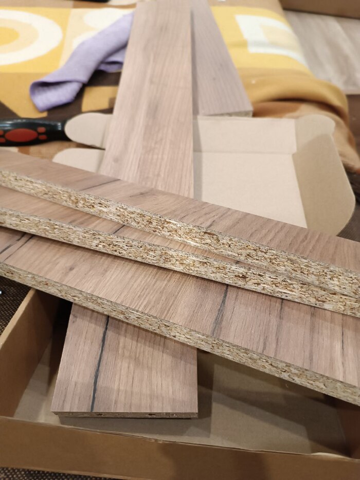 Аналогичным образом, не закроймлены детали номер 6, планки у самого пола. Там должно быть дно комода, но решили еще сэкономить ламината и сделали две планочки. Поскольку меламиновой кромки у меня не было, пришлось воспользоваться алюминиевым скотчем и закрыть края. Немножко колхозно, но что делать.