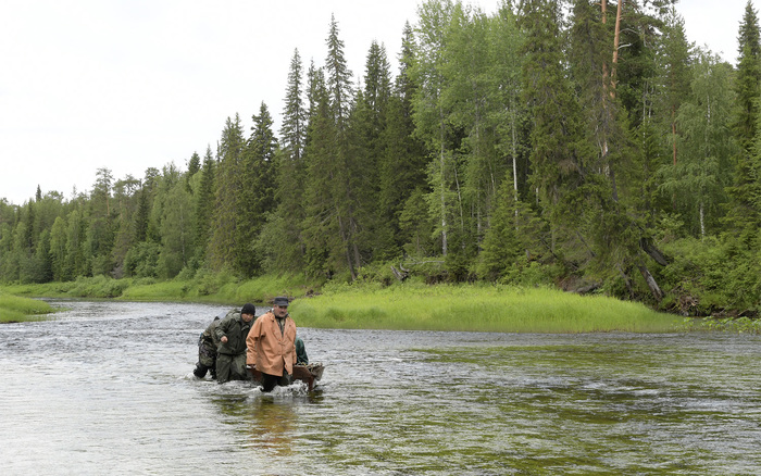 Потом мы поднимались на моторных деревянных лодках вверх по течению реки. Юла - не самая многоводная река. На перекатах приходилось всем выбираться из лодок и работать бурлаками. Поэтому поднимались медленно, примерно 70 километров за два дня. Нашими проводниками были местные охотники, к угодьям которых вплотную подошли массированные вырубки.