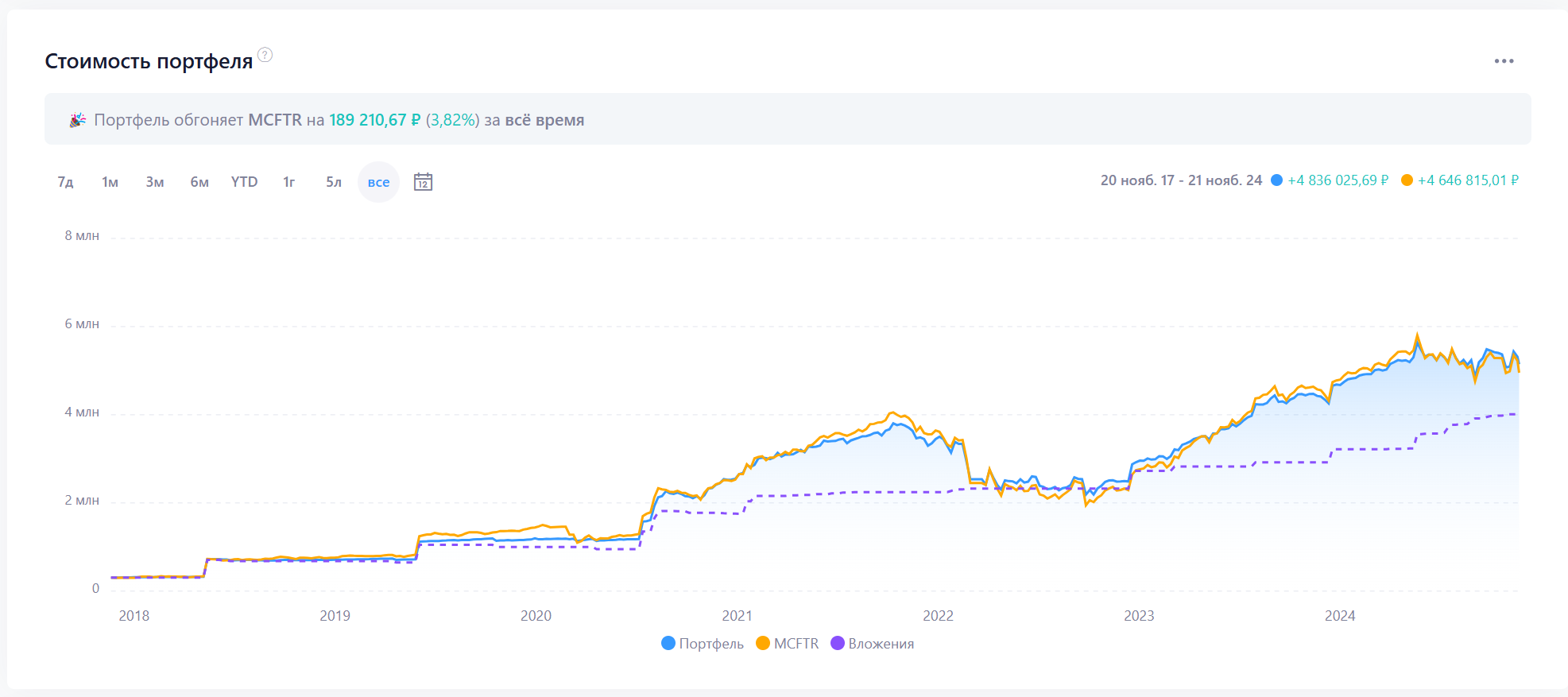 Мой портфель обгоняет индекс Мосбиржи с учетом дивидендов (MCFTR) на 3.8%, а ваши управляющие так могут?