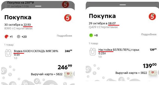 Как-то узнав на кассе что у меня там неприлично много баллов захотел я посмотреть историю покупок где-то за два месяца. Захожу, смотрю и немного офигеваю от некоторых своих покупок. Начинаю вспоминать где и когда я мог приобрести подобное. И тут в глаза бросается одна деталь – город, в котором была совершена эта покупка, Стерлитамак, примерно 100 км от Уфы. Там я уже лет сто не был и не планирую. В итоге мне стала интересна двойная жизнь моей карты и я просмотрел всю историю. Разнообразностью покупок история не пестрила, наоборот очень консервативный подход был у её обладателя.