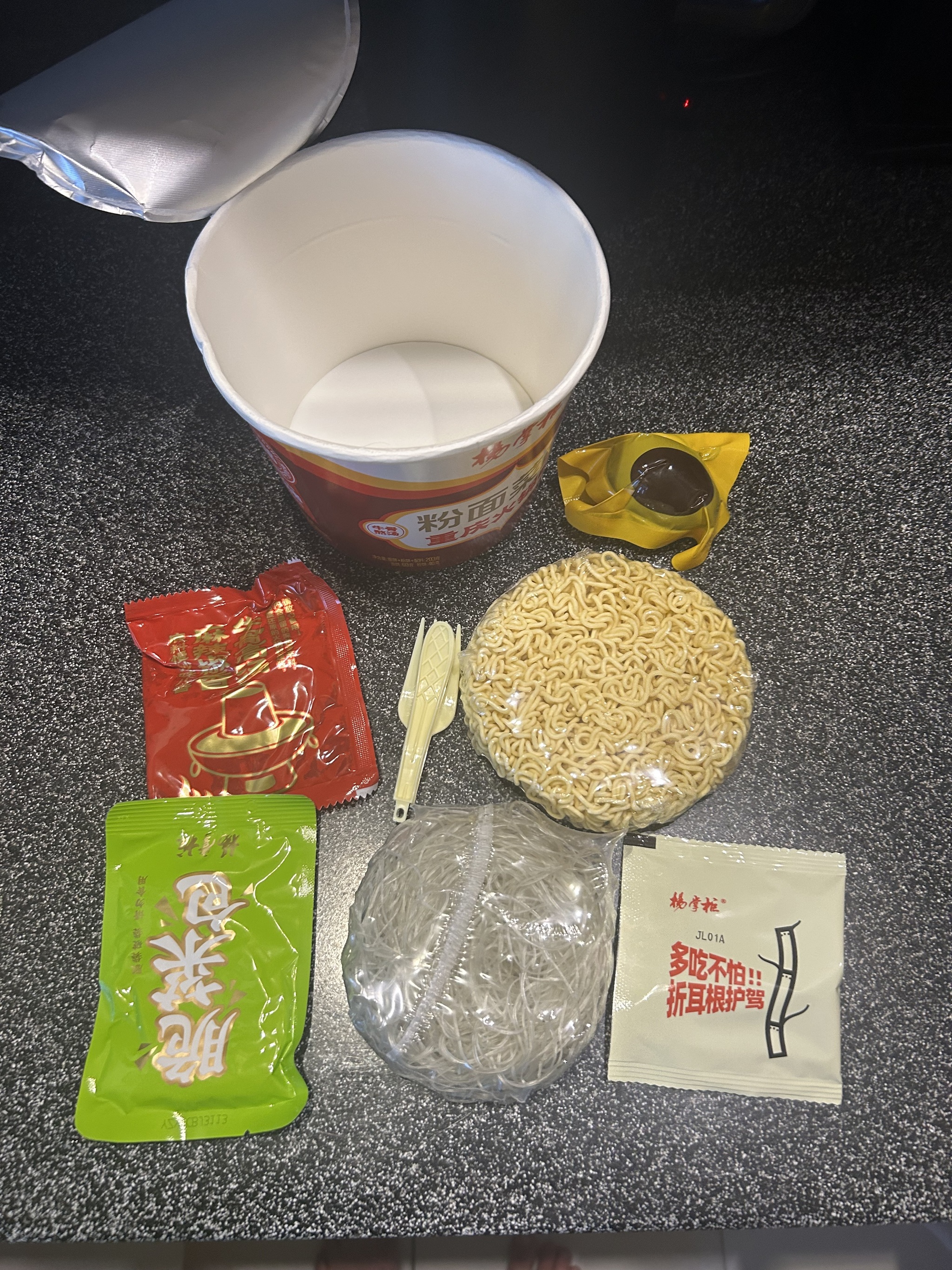У меня наполнение сильно богаче: два вида лапши, побеги сои, густющий мясной острый соус и маринованное яичко. А вот что в белом пакетике, это вопрос со звездочкой.
