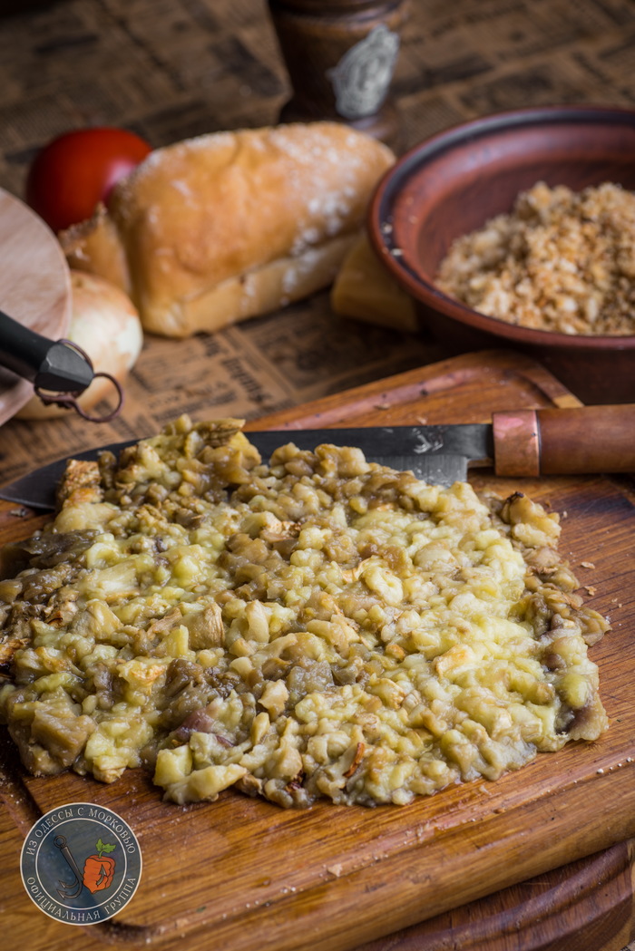 - Уже остывшие баклажаны избавить от корочки. Можно просто очистить руками, но мне было сподручнее столовой ложкой просто соскоблить мякоть, придерживая за один край. Готовую мякоть измельчить с помощью ножа на доске.