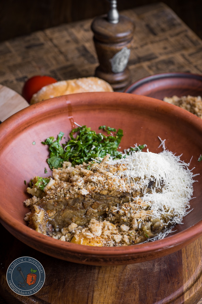 - В большой миске смешать фарш, баклажаны, яйцо, пармезан, нарубленный базилик и слегка отжатый хлеб. Приправить по вкусу солью и черным перцем. Вымесить фарш. В этот раз чрезмерных усилий можно не прикладывать и о дно миски тоже можно не бить. Можно просто хорошо и основательно вымешать. Тогда шарики не потрескаются и будут держать форму.