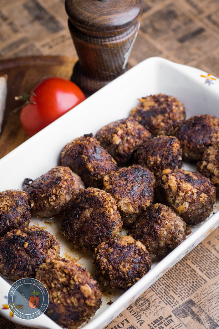 - Разогреть масло в сковороде так, чтобы дно было покрыто. Каждую фрикадельку обвалять в сухарях и отправить в сковороду. Старайтесь не перегружать сковороду. Если «руки еще не набиты» и не уверены, что будете быстро скатывать фрикадельки и обваливать, можете заранее прикинуть, сколько поместится в сковородку, заранее скатать и быстро обвалять и лишь потом все сразу поместить в масло. Жарить, изредка переворачивая, до золотистого цвета. Дожарить остальное.
