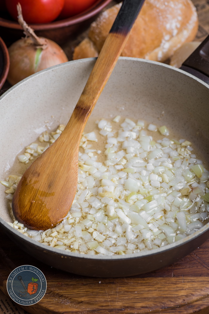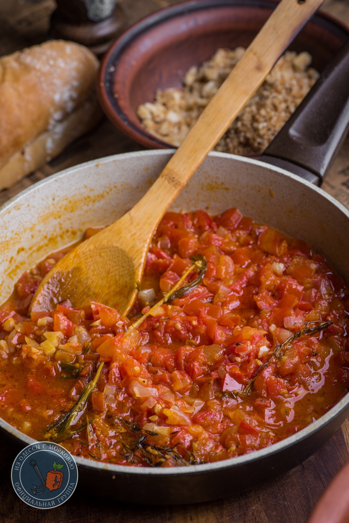 - А пока фрикадельки чиллят в духовке, можно заняться соусом. В этот раз я не мудрствуя лукаво сообразил максимально простой соус в деревенском стиле. Луковица кубиком слегка обжаривается в масле, добавляется 2 зубка чеснока, а спустя полминуты добавляются 5-6 помидоров, нарезанных кубиками. В этот раз шкурку можно и не снимать. Главное, чтобы помидоры были вкусными. Посолить, поперчить, кинуть по желанию веточку розмарина-тимьяна-базилика, накрыть крышкой и тушить на небольшом огне минут 20. А как время пройдет, попробовать, отрегулировать по вкусу на соль, перец и сахар и при необходимости доготовить, ели помидоры были слишком сочные и соус вышел жидким.