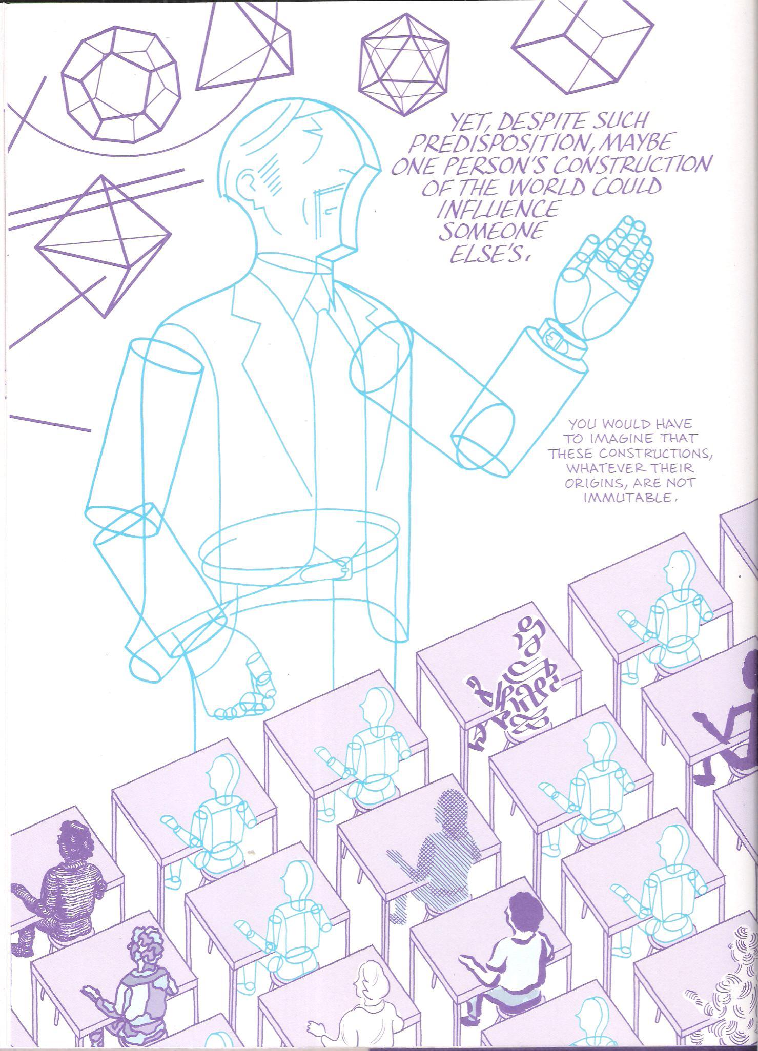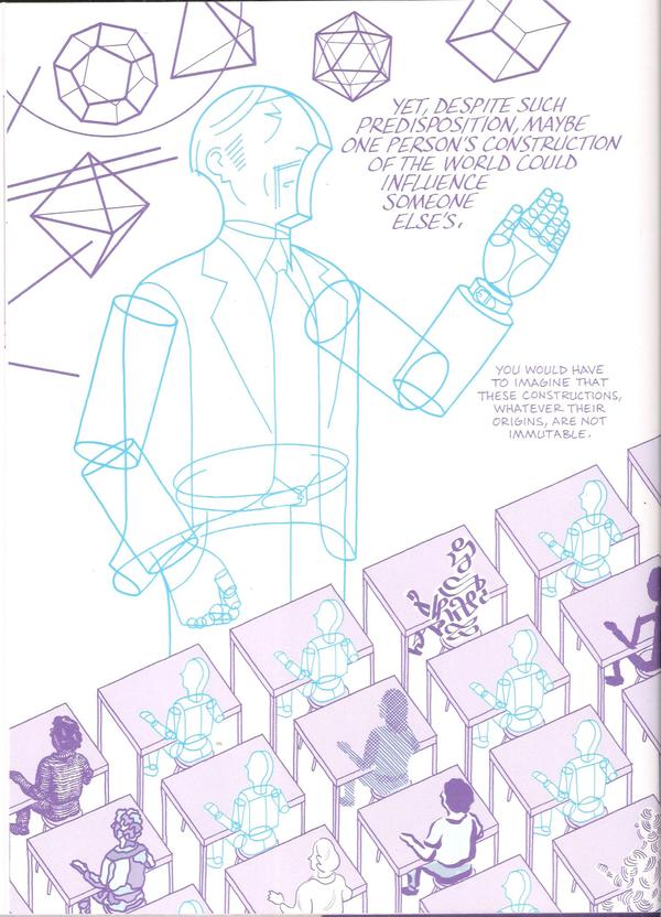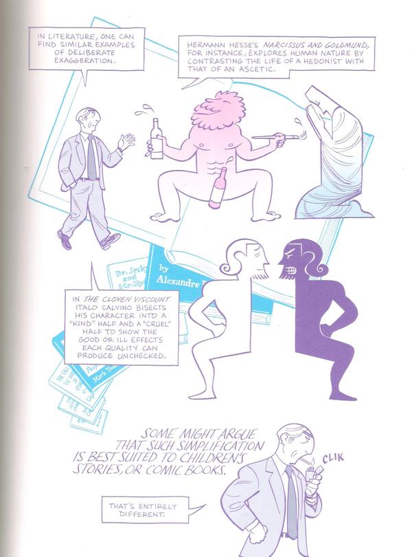 Бывают истории, в которых важную роль играет текст, рисунок не так уж и принципиален, это лишь способ отображения персонажей и ситуаций, в которые они попадают. Бывают истории, где именно рисунок, а не текст играет главенствующую роль, в конце концов, существуют примеры хороших комиксов без текста вовсе. Asterios Polyp – комикс третьего типа, в котором важен как текст, так и рисунок, отвечающий за значительную долю сюжета, позволяющий более точно и правильно показать персонажей и раскрыть их характеры.