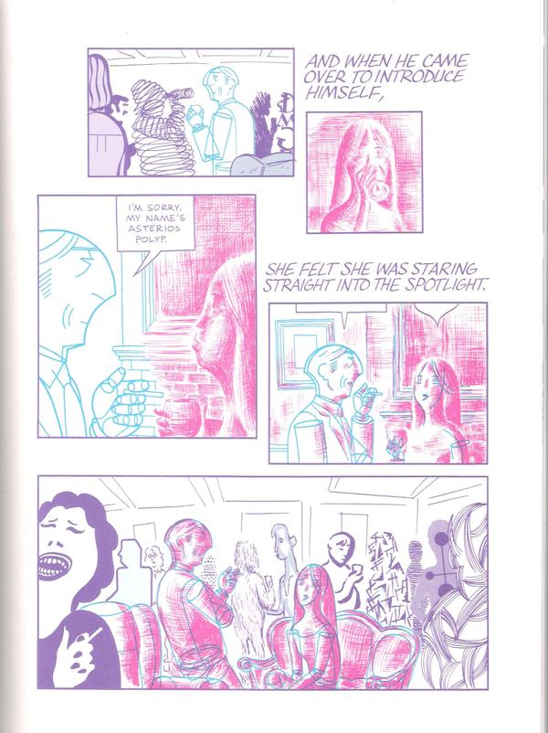 Главный герой – Астериос Полип, архитектор с греческими корнями и отсылок к Древней Греции, ее мифам и, конечно же, архитектуре, в работе Мазукелли полно. Астериос – человек невероятно талантливый, награжденный множеством премий, человек известный и уважаемый, преподающий архитектуру юным дарованиям. Все его здания идеально спроектированы, обладают четкой формой и прямотой линий. Каждый проект Полипа – шедевр, все это признают. Однако, ни одно из его зданий так и не было построено. Астериос – архитектор-теоретик и человек довольно неприятный, насквозь пропитанный снобизмом, ощущением собственной значимости и чувством превосходства. Он из людей, считающих, что есть лишь два мнения – его и неправильное. Характер персонажа, его отношение к людям, жизни в целом великолепно показаны не только благодаря тексту, но и рисунку. Начиная с отображения героя на троне с лавровым венцом на голове, возвышающегося надо всеми, заканчивая самим внешним видом архитектора, который повторяет прямые углы и линии его собственных творений. Доходит до того, что даже обувь, Астериос носит соответствующую его архитектурному стилю, пусть это и приносит неудобства. И главный герой единственный персонаж с прямоугольными баблами текста. Даже шрифт тут у реплик Полипа строгий, с четко выделенными прямыми линиями, более того, свой шрифт имеет каждый персонаж.
