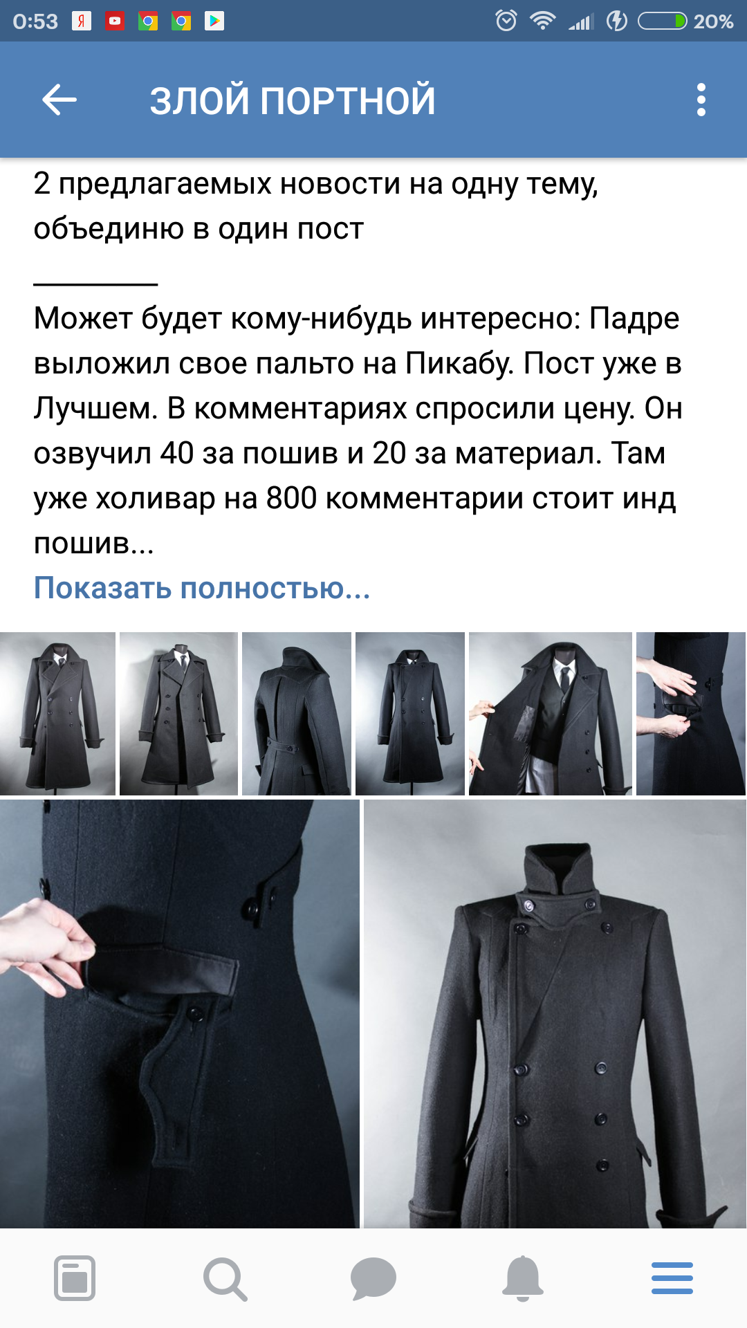 Мой клиент предпочитает деловой стиль и много ходит пешком. От пальто ожидается приличный срок службы в 10-15 лет, при этом оно должно быть изящным и не похожим на тулуп) Я взял итальянскую шерсть, мягкую и приятную на ощупь. Дополнил толстой вискозной подкладкой, стойкой к истиранию. Значительную разницу между широкими плечами и узкой талией я подчеркнул дополнительными вытачками. Вот что получилось.