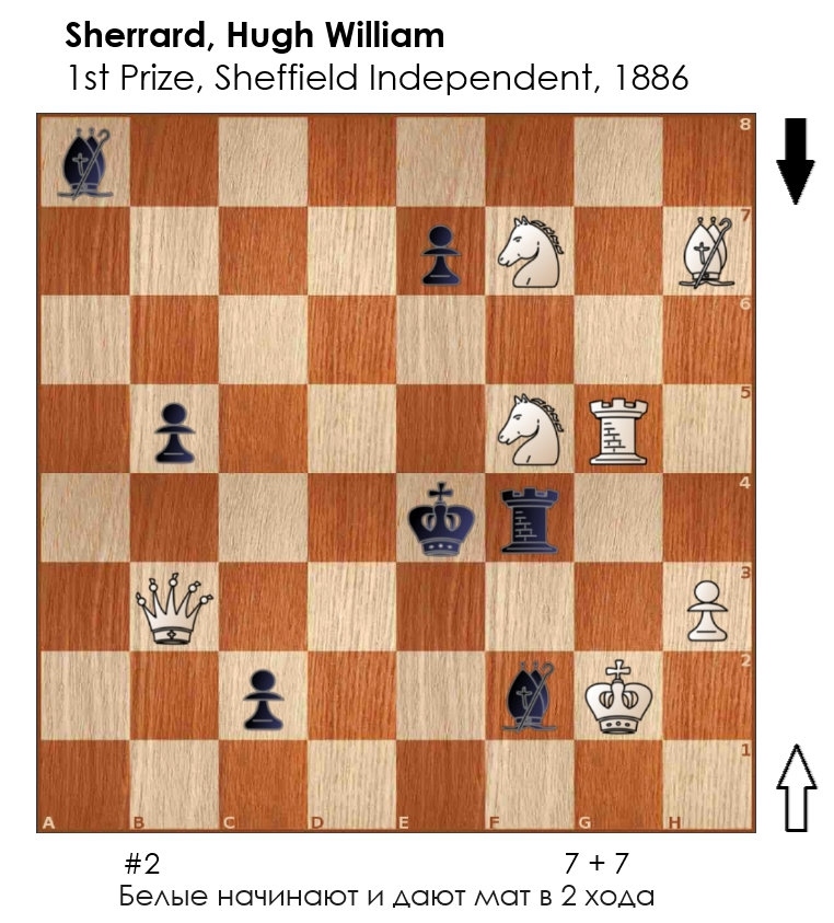 11 scootin Шахматы Двухходовочка #239 1 год назад Двухходовая композиция английского проблемиста Хью Уильяма Шеррарда (Hugh William Sherrard, 1862 - 1892), завоевавшая первое место турнира британского печатного издания "Sheffield Independent" в 1886 году. Шахматы Шахматные задачи Задача Головоломка Ещё 0