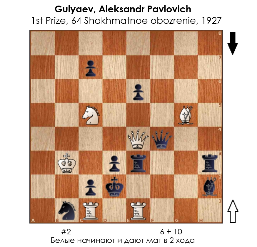 Двухходовая задача советского металловеда, шахматного композитора, международного гроссмейстера и международного арбитра по шахматной композиции Александра Павловича Гуляева (псевдоним: Александр Грин, 1908, Санкт-Петербург - 1998, Москва), победившая в конкурсе журнала "64 Шахматное обозрение" в 1927 году.