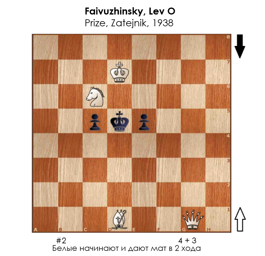 Несложная двухходовая миниатюра москвича Льва Ошеровича Файвужинского (родился в 1922 году - в августе 1942 младший лейтенант Л. О. Файвужинский пропал без вести в боях под Сталинградом), отмеченная призом детского ежемесячного журнала "Затейник" в 1938 году.