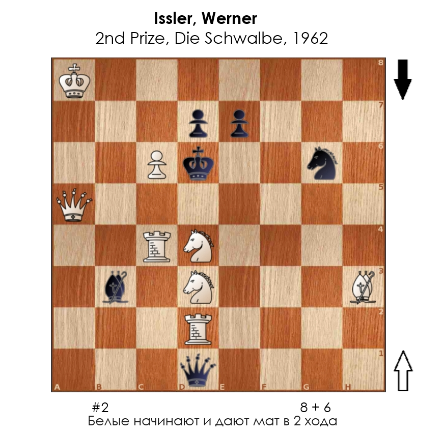 Двухходовая задача швейцарского шахматного композитора Вернера Исслера (Werner Issler, 1933 - 2023), получившая второй приз турнира немецкого шахматного журнала "Die Schwalbe" в 1962 году.