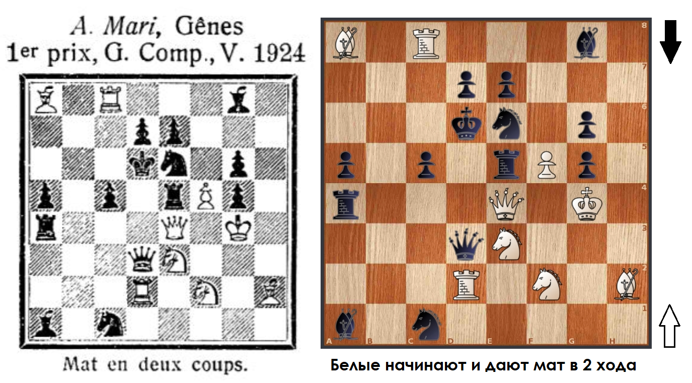 Ещё одна двухходовая композиция (предыдущая задача) итальянца Альберто Мари (Alberto Mari, 1892 - 1953), взявшая первый приз в майском турнире 1924 года, организованном объединением шахматных композиторов "Good Companion".