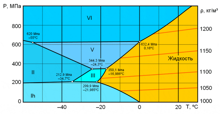 Зависимость состояния воды от давления и температуры (фазвая диаграмма). По вертикали — давление (1 МПа = 10 атмосфер), по горизонтали — температура. Оттенками синего отмечены модификации льда, оранжевыми линиями — точки одинаковой плотности жидкой воды / ©hmong.ru