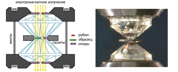 Схема ячейки с алмазными наковальнями и фотография центральной части ячейки. Гаскет – уплотнительная прокладка из рениевой фольги. Микрокристалл рубина используется в качестве датчика давления (длина волны флуоресценции рубина зависит от давления) / ©wikipedia.org